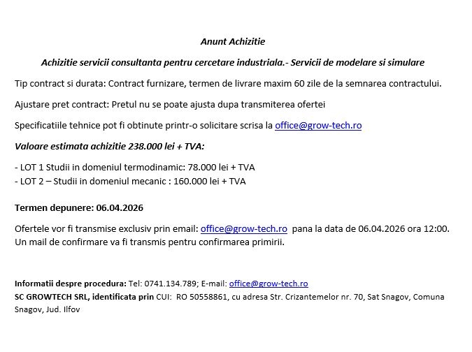 Informatii despre procedura: Tel: 0741.134.789; E-mail: office@grow-tech.ro.
