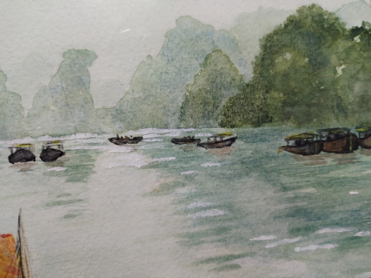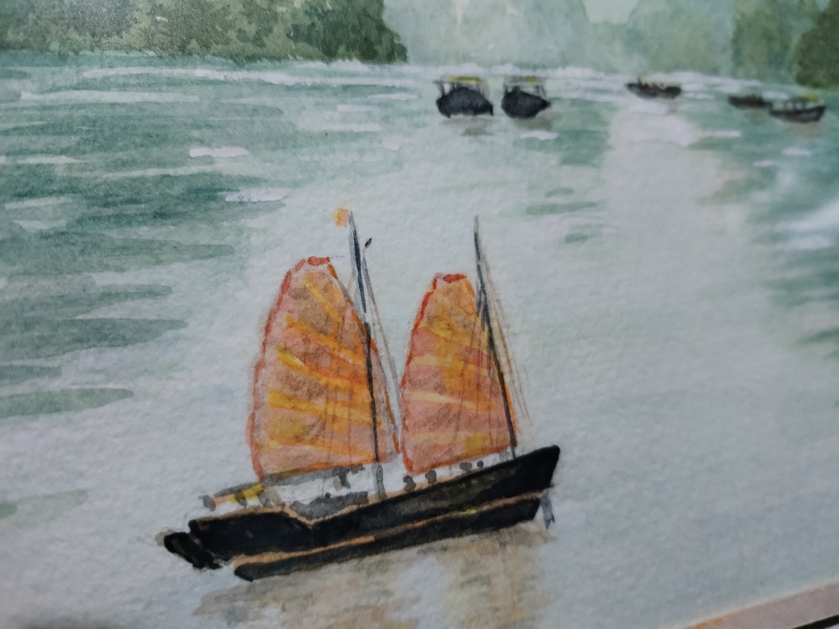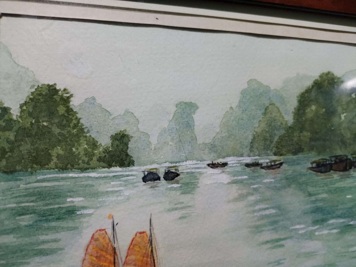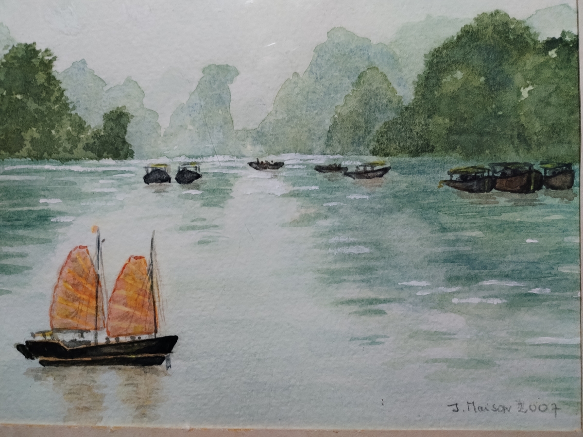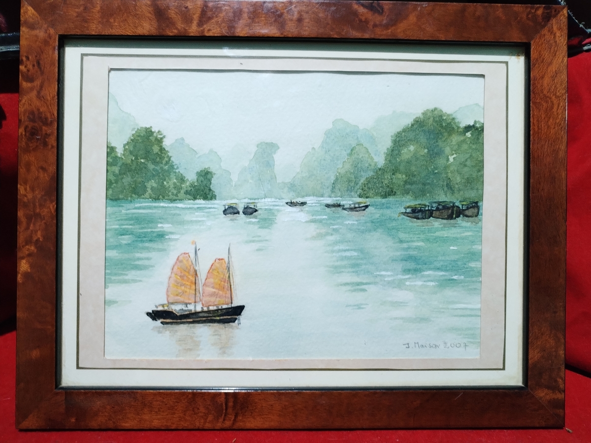 Lucrarea reda un peisaj marin linistit, cu barci cu vele si reliefuri verzi, pictat in tonuri delicate si transparente specifice tehnicii acuarelei.