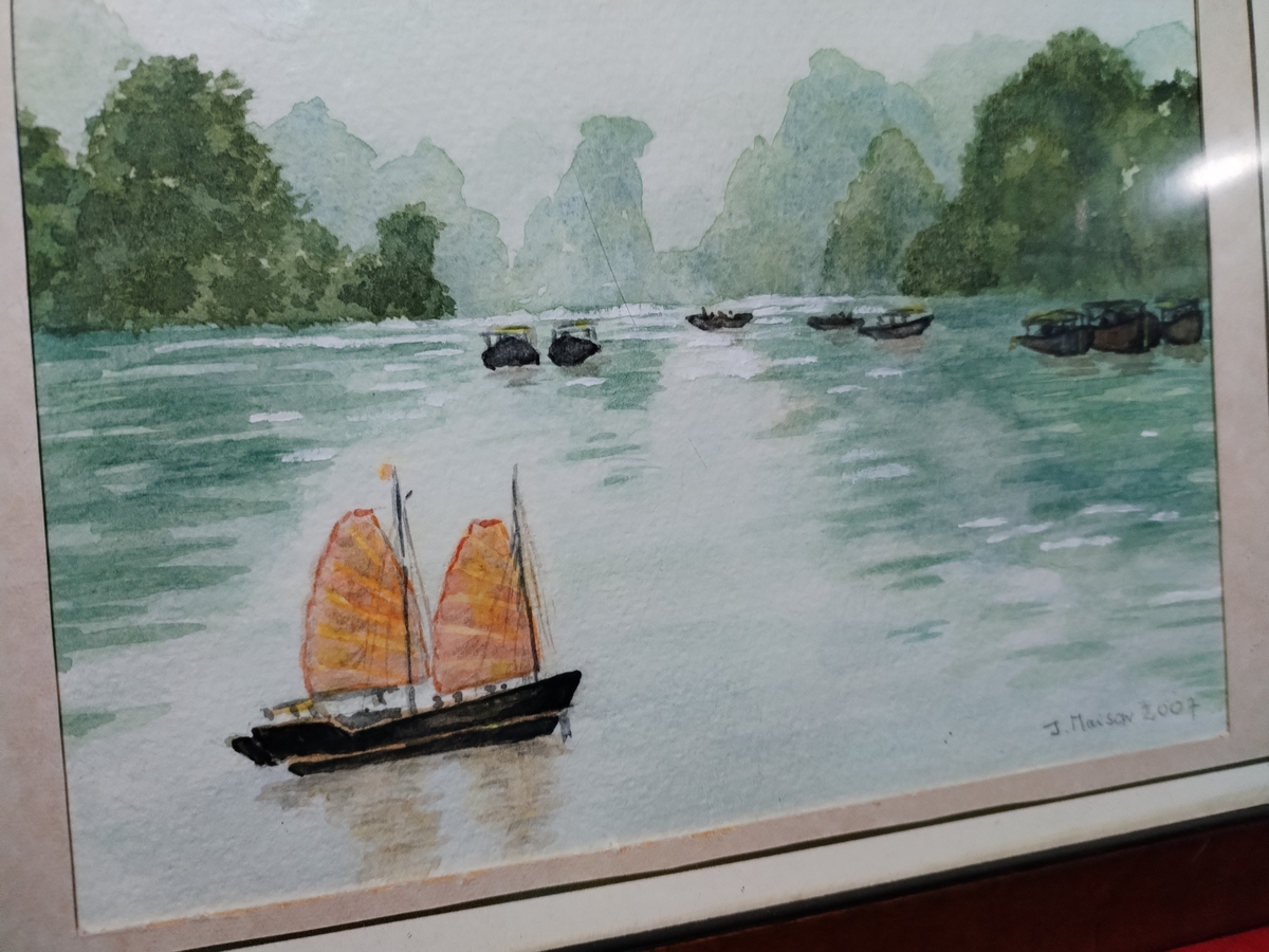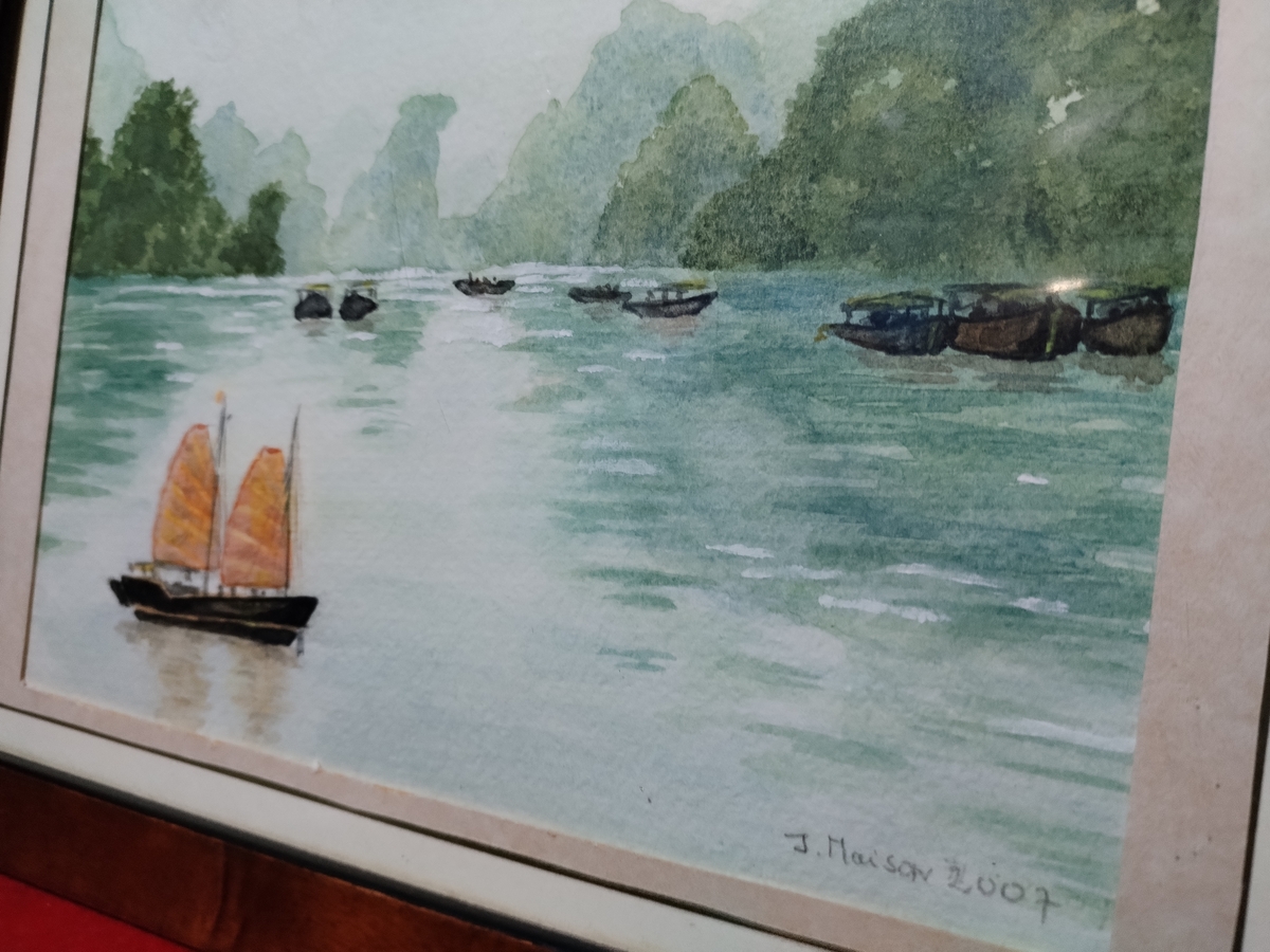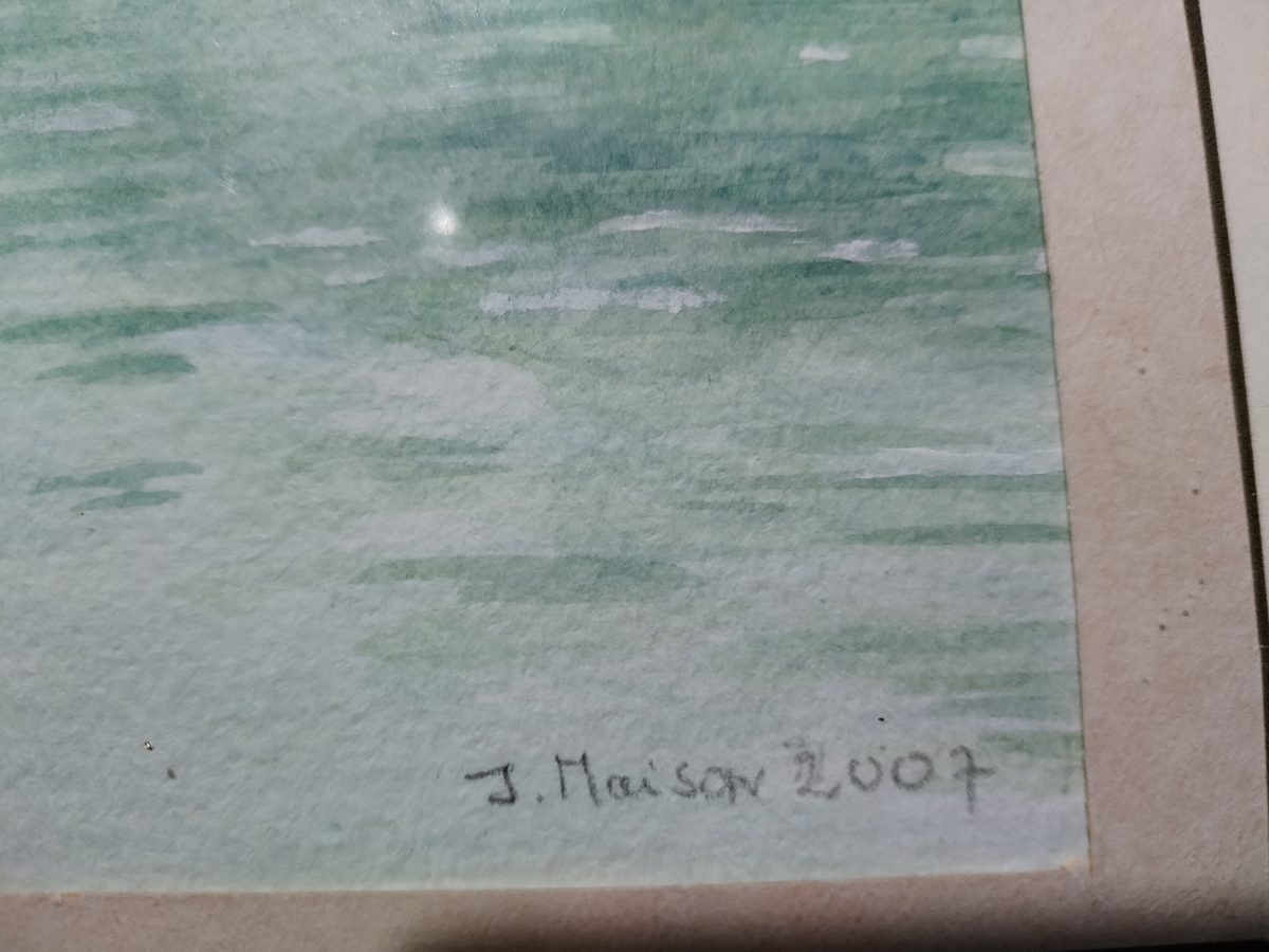 Acuarela franceza peisaj marin, realizata pe hartie de bumbac si semnata J.Maison, anul 2007.