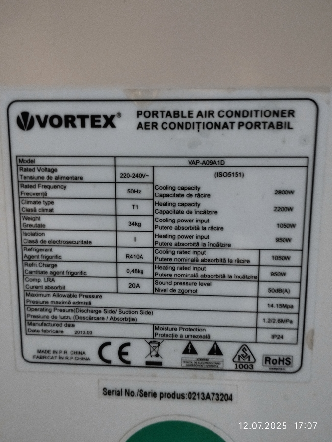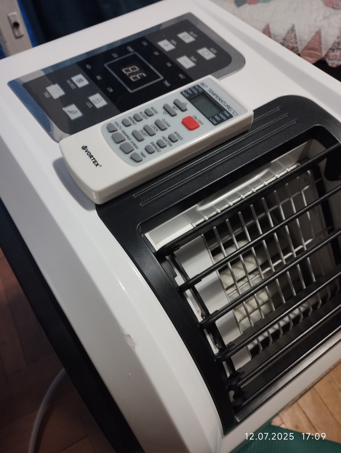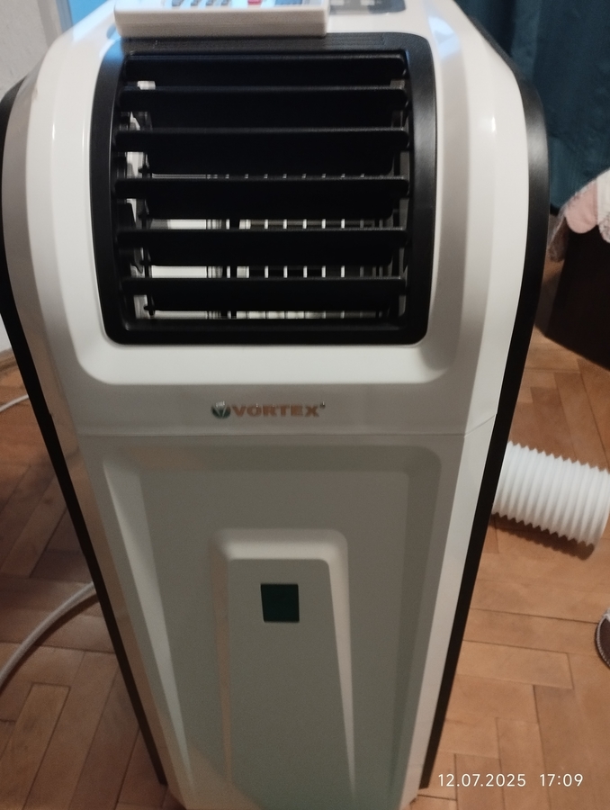 Vortex, nefolosit, toate accesoriile, burlan de evacuare, furtun pentru apa din condens, telecomanda. ,9000btu, cald, rece, dezumifivare, ventilatie, mai multe trepte de putere.