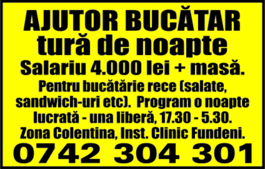 salariu 4000 lei, plus masa asigurata, pentru bucatarie rece, salate, sandwich-uri etc., program o noapte lucrata, una libera, 17:30 - 5:30. Zona Colentina, Fundeni;