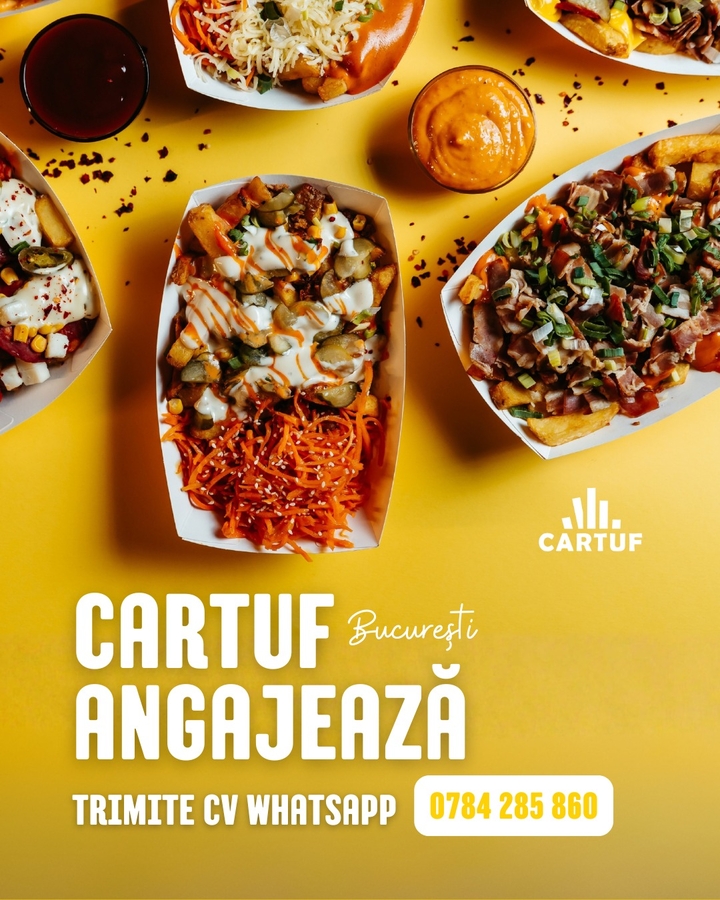 Suntem pe piata de peste 8 ani si acum aducem la Bucuresti gustul care ne-a facut cunoscuti: cartofi prajiti la con si meniuri simple si gustoase. Cautam oameni faini, tineri, muncitori si cu atitudine pozitiva, alaturi de care sa construim echipa CARTUF.