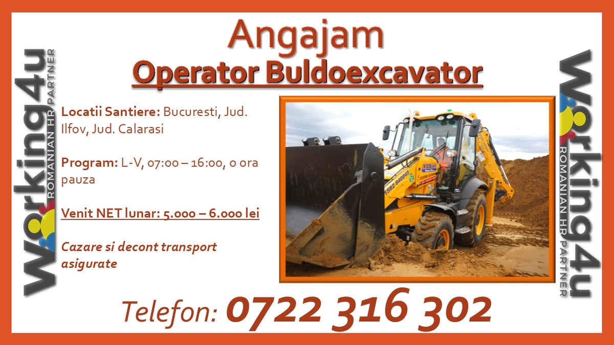 Pentru clientul nostru, companie aflata pe piata de peste 15 ani, specializata in lucrari si instalatii electrice, cu sediul in zona Sectorul 2, Bucuresti si santierele in zona Jud. Ilfov si Calarasi suntem in cautare de noi colegi cu experienta pentru postul de Operator Buldoexcavator.