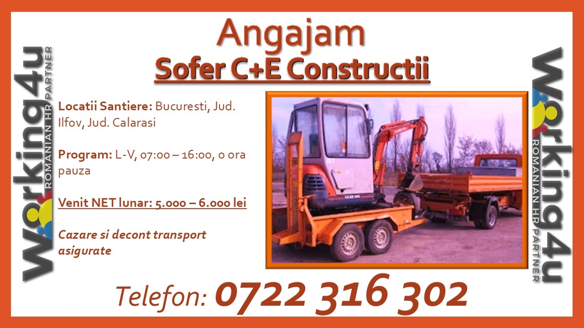 Pentru clientul nostru, companie aflata pe piata de peste 15 ani, specializata in lucrari si instalatii electrice, cu sediul in zona sectorul 2, Bucuresti si santierele in zona jud. Ilfov si Calarasi suntem in cautare de noi colegi cu experienta pentru postul de sofer C+E constructii.