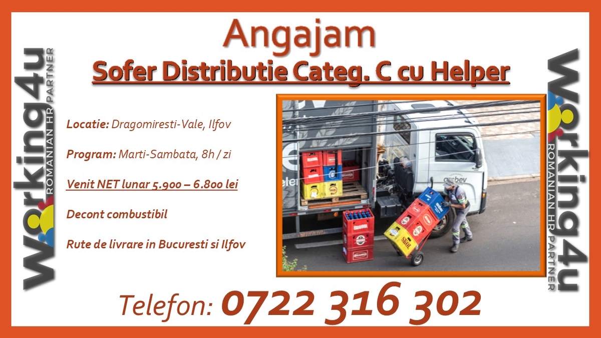 Pentru clientul nostru, jucator de top in domeniul distributiei de marfuri, cu punctul de incarcare situat in Dragomiresti-Vale, Jud. Ilfov cautam un nou coleg pentru postul de Sofer pe duba 7,5T pentru distributie livrari in zona Bucuresti - Ilfov.
