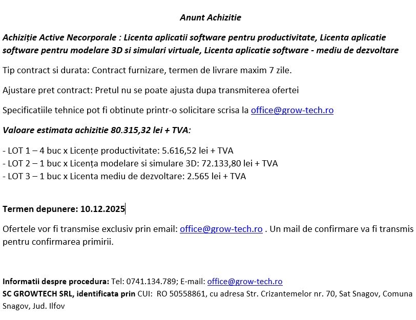 Informatii despre procedura: Tel: 0741.134.789; E-mail: office@grow-tech.ro