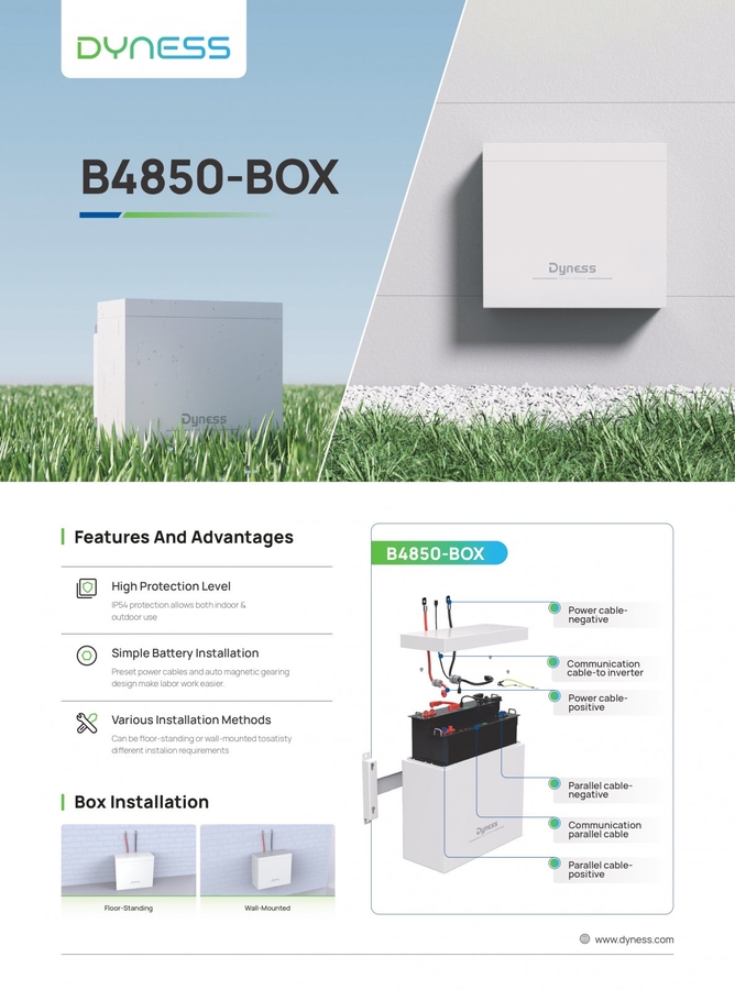 Noua generatie de module de baterii solare cu litiu Dyness B4850-BOX este format din 2 acumulatoare B4850 si ofera o capacitate mai mare de stocare a energiei in mai putin spatiu. Dyness B4850-BOX are o capacitate de stocare de 4,8 kWh pe 48V si este ideala pentru inlocuirea bateriilor vechi si grele cu plumb acid. Acesta adopta tehnologia LFP (Litiu-Fier-Fosfat) pentru siguranta maxima si un ciclu de viata mai lung. Bateria Dyness B4850-BOX este compusa din 2 module B4850 de 2,4 kWh pentru un total de 4,8 kWh per cutie si pot fi conectate pana la 2 cutii in paralel, astfel incat sa putem extinde capacitatea de stocare in functie de nevoile instalatiei noastre fotovoltaice.