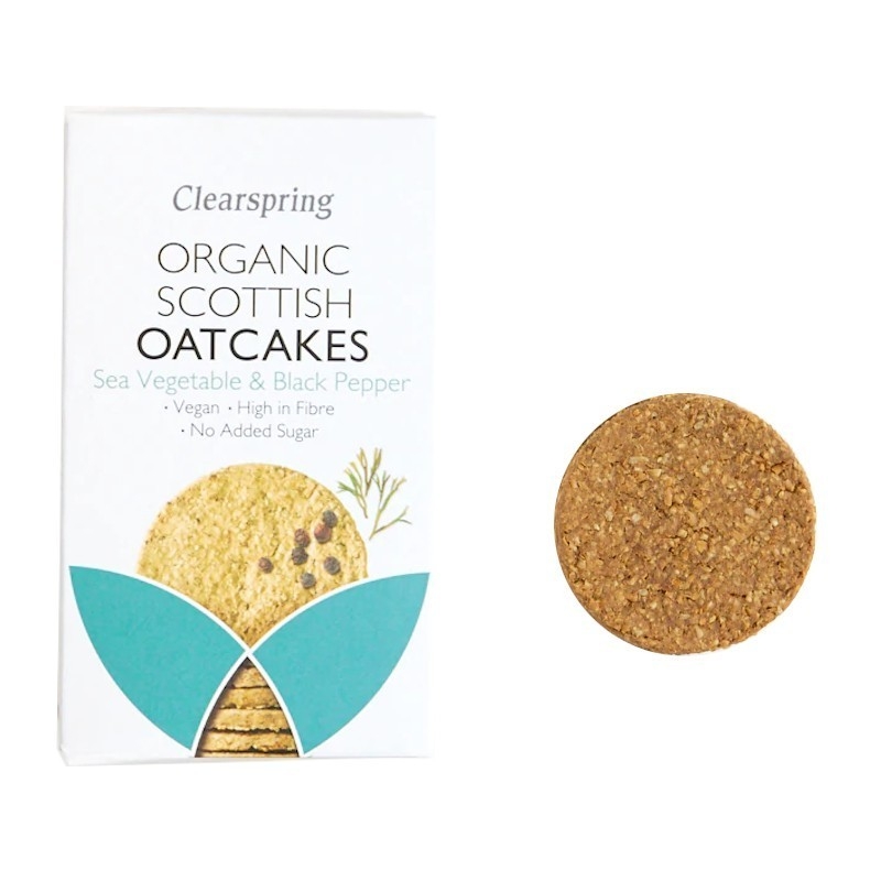 Biscuitii ecologici cu ovaz, alge marine si piper negru "Organic Scotish Oatcakes" Clearspring sunt o combinatie de biscuiti traditionali din ovaz, aroma picanta si usor sarata a algelor de mare dulse si notele calde de piper negru si usturoi. Savuratii ca atare pentru gustul lor distinctiv, cu toppingurile preferate sau servitii cu hummus, peste care imprastiati ceva salata de mare Clearspring, pentru o aroma mai intensa de alge de mare. Sunt preparati dupa reteta originala Clearspring din ingrediente ecologice de cea mai buna calitate, fiind pregatiti cu dragoste in loturi mici de mesteri brutari ce fac aceasta de patru generatii in Highlands, Scotia. Selectarea atenta a ingredientelor este secretul aromei delicioase si a texturii cremoase.