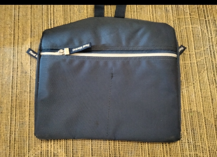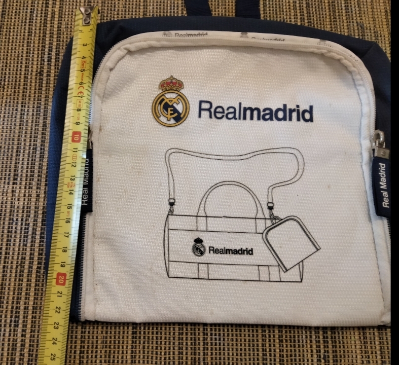 Pe partea din fata este desenata o geanta de voiaj Real Madrid.