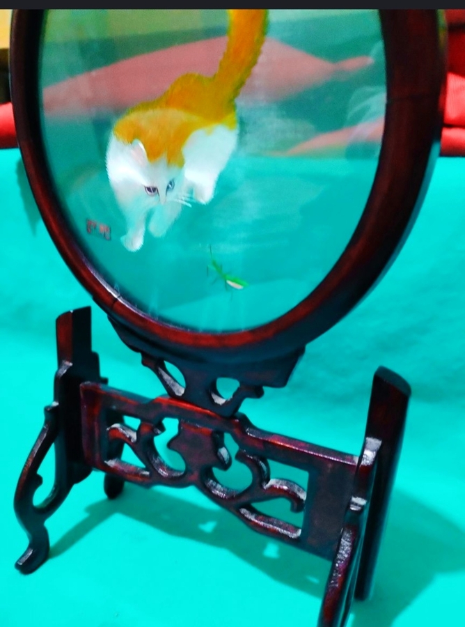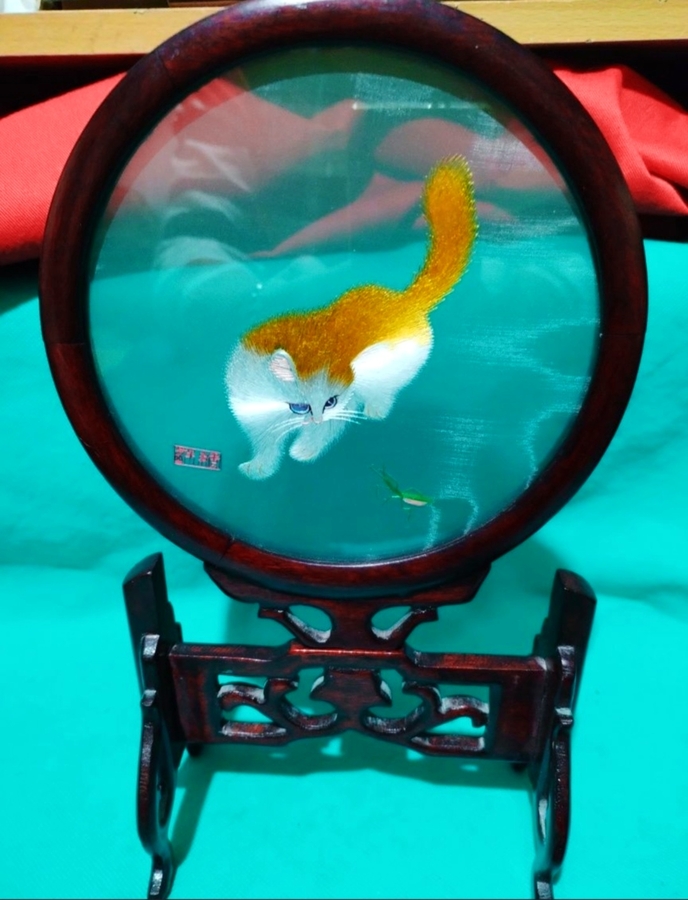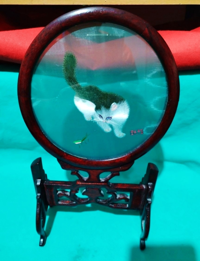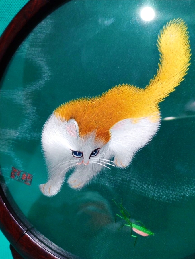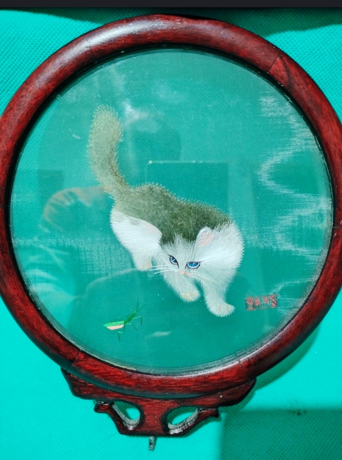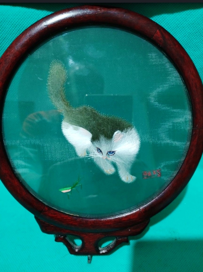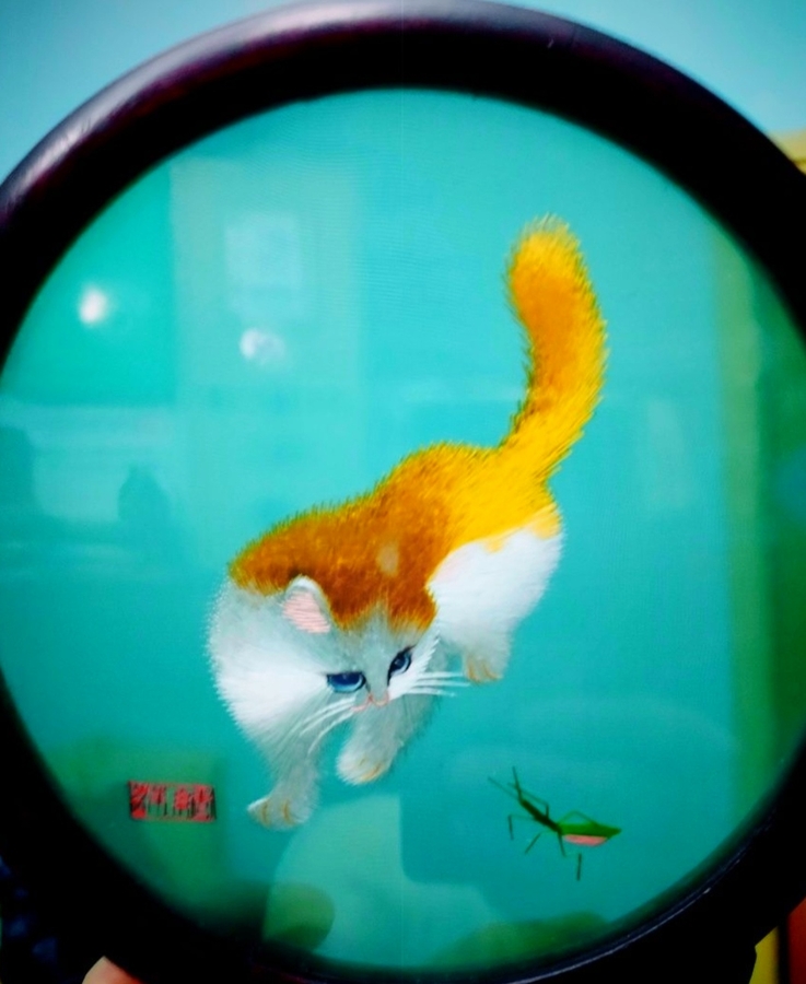 Veche broderie chinezeasca manuala Suzhou, realizata pe matase, cu decor o pisicuta alergand dupa o lacusta.