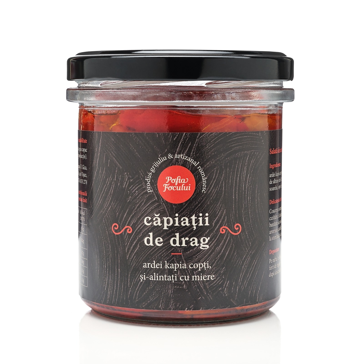 Ingrediente: ardei kapia copti, miere de albine, ulei de floarea soarelui, otet de mere, usturoi, sare, boabe de piper.