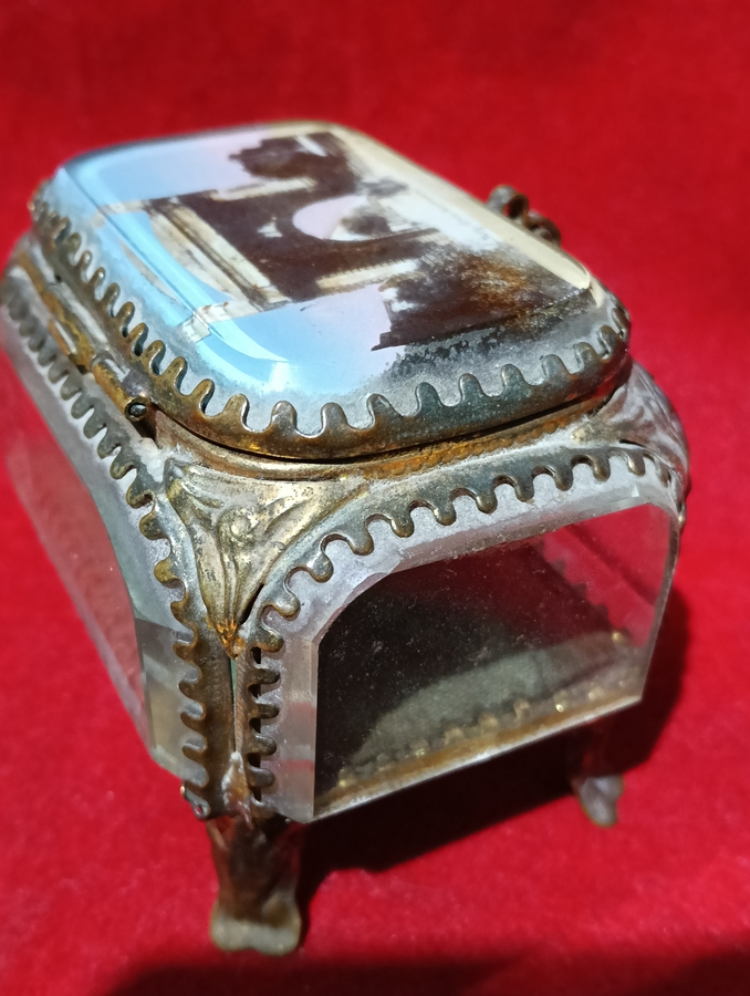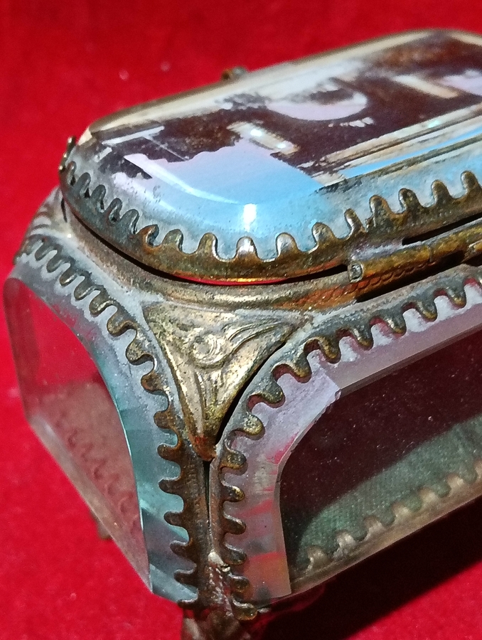Caseta de bijuterii, anii 1890-1900, confectionata din geamuri de cristal bizotat si fatetat pe toate laturile.