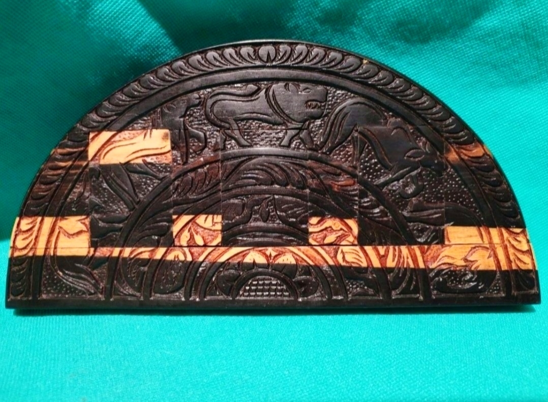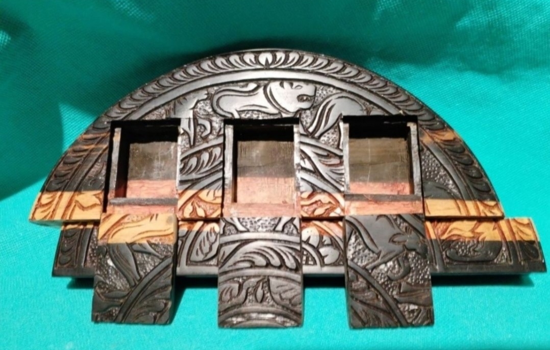 Are forma semicirculara, este sculptata manual, cu motive zoomorfe si arhitecturale si ascunde trei sertare secrete ingenios integrate.