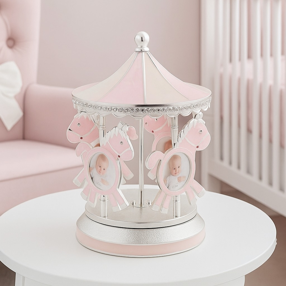 Acest carusel muzical pentru bebelusi este o piesa de decor eleganta, placata cu argint, cu spatii special pentru fotografiile celui mic. Este cadoul perfect care decoreaza camera bebelusului si pastreaza cele mai frumoase momente. Alege varianta pe roz pentru fetite sau pe albastru pentru baietei. Un cadou de lux care da startul amintirilor! Este cel mai vandut cadou de botez si Mot/Turta!