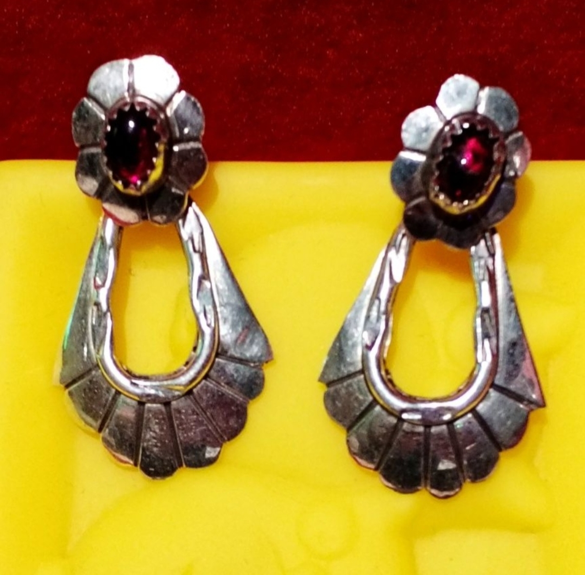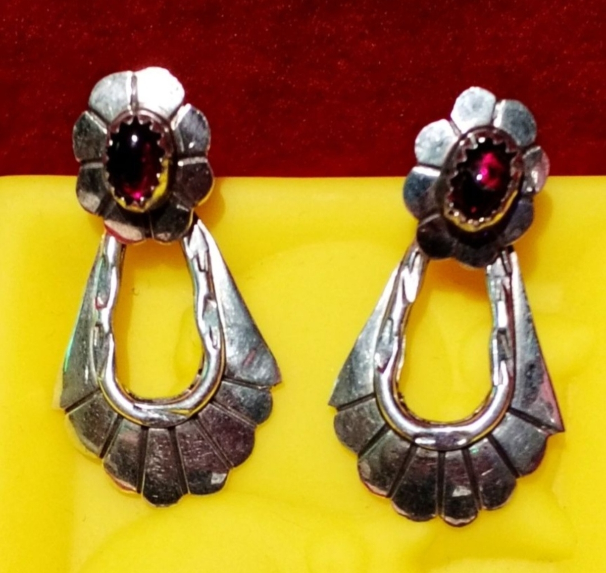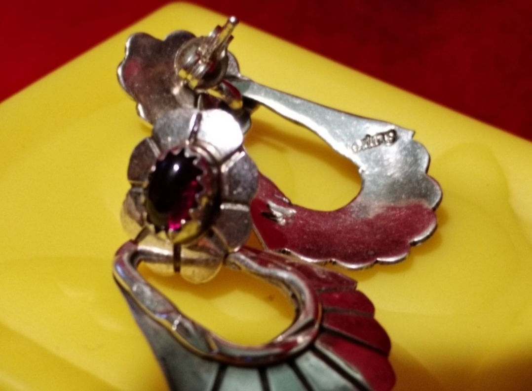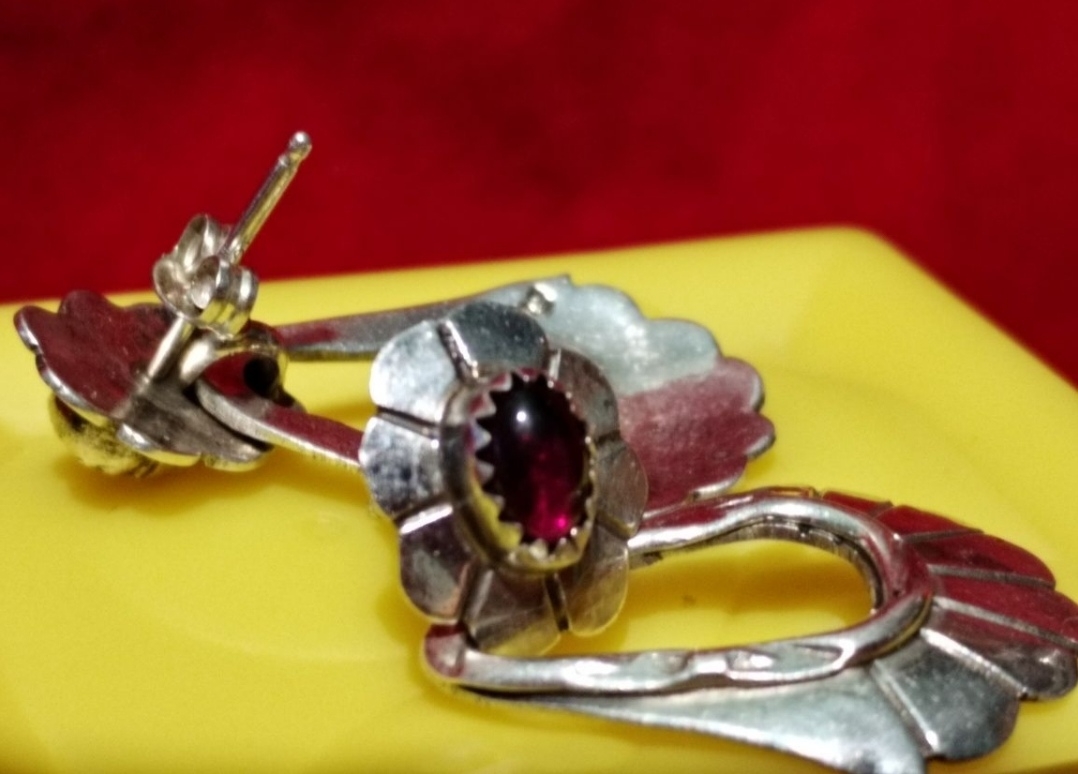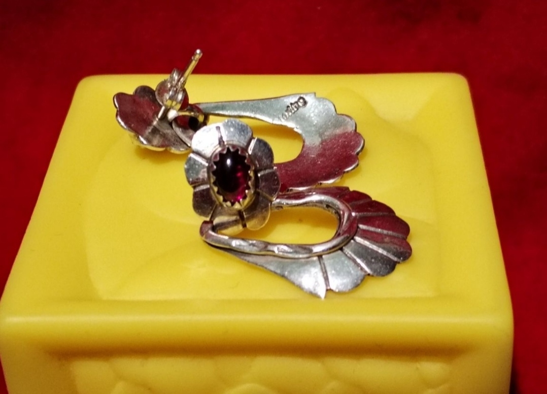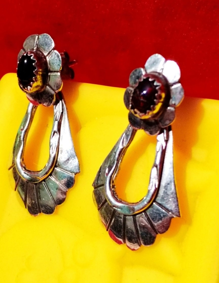 Cercei din argint sterling 925 cu granat, semnati (marcaj) de artista Navajo, Marie Begay, anii 1970.