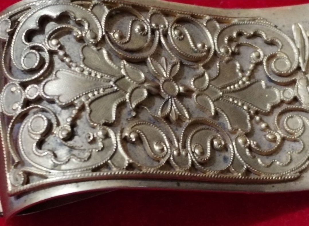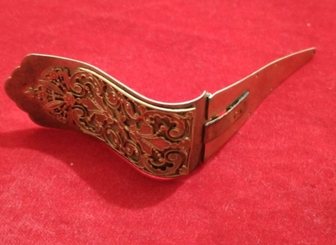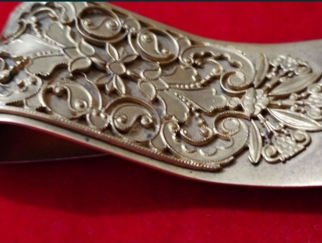 Partea frontala este decorata cu model bogat in detalii vegetale si volute ornamentale, caracteristice epocii victoriene.