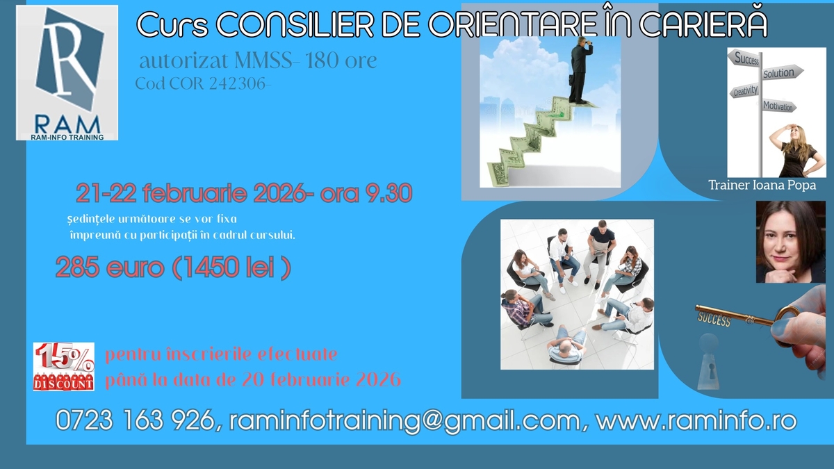 Curs autorizat ANC, MECT si MMSS - consilier de orientare privind cariera - Cod COR 242306 - 180 ore.