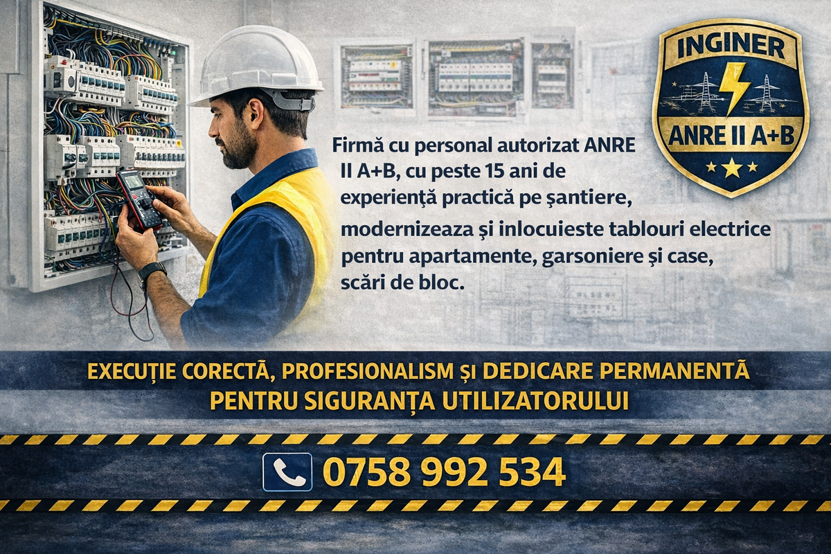 Inginer instalatii electrice, autorizat ANRE II A+B, administrator firma, in curs de atestare B (dosar depus), caut colaboratori – electricieni autorizati cu PFA/SRL - pentru lucrari de instalatii electrice interioare, modernizari tablouri electrice, constatari si remediere probleme in instalatii electrice pentru Mun. Bucuresti si imprejurimi.