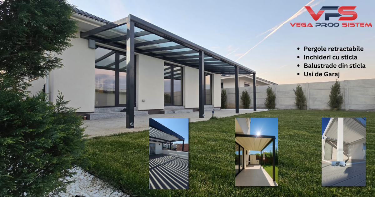 Vega Prod Sistem este specializata in pergole bioclimatice, pergole retractabile cu membrana PVC si inchideri terase din sticla glisanta sau tip ghilotina.