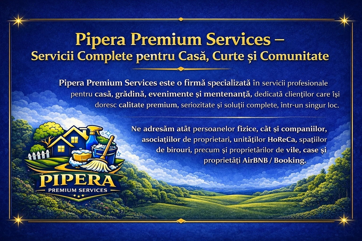 Pipera Premium Services este o companie locala care ofera servicii profesionale pentru: curatenie spalare geamuri; ingrijire curti si spatii verzi; amenajari exterioare; mentenanta piscine; sisteme de irigatie; lucrari usoare de constructii si reparatii;