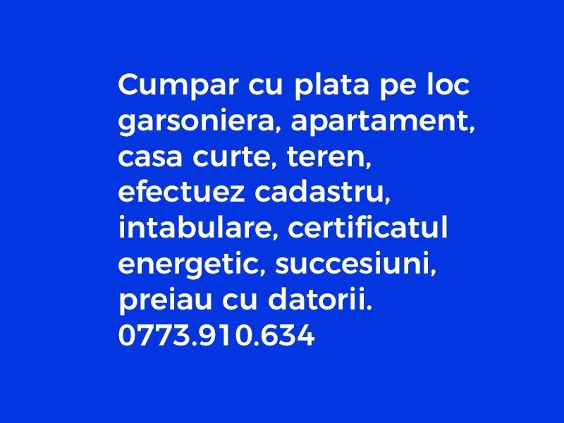 cu plata imediat garsoniera apartament casa curte, teren efectuez cadastru, intabulare, certificat energetic, succesiuni. Rog seriozitate