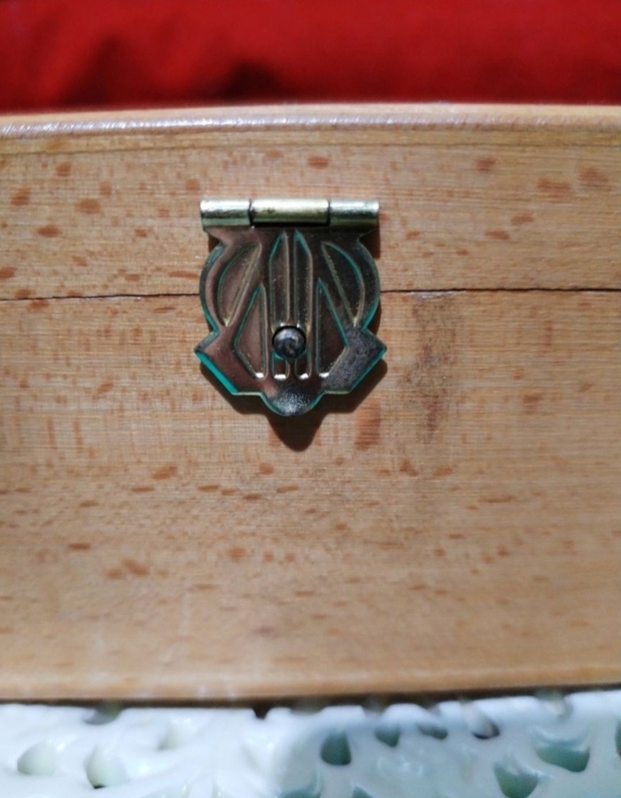 Cutia este frumos lacuita, realizata din lemn masiv cu dimensiunile de 19x12x7cm.