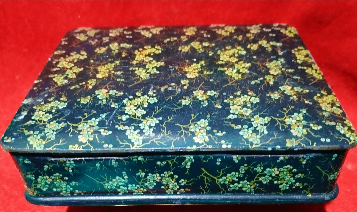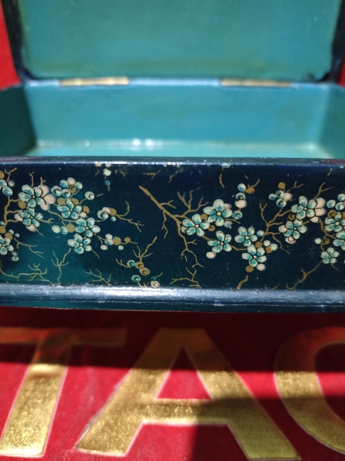 Confectionata din lemn fin lacuit paulownia sau kiri, cu model floral rafinat si interior verde turcoaz.