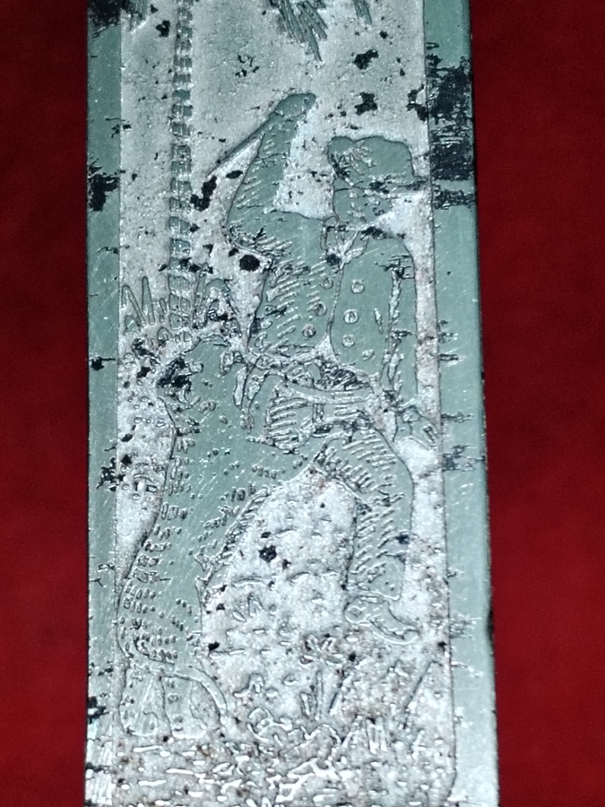 Pe lama este gravat atacul unui Jaguar si riposta posesorului cutitului.