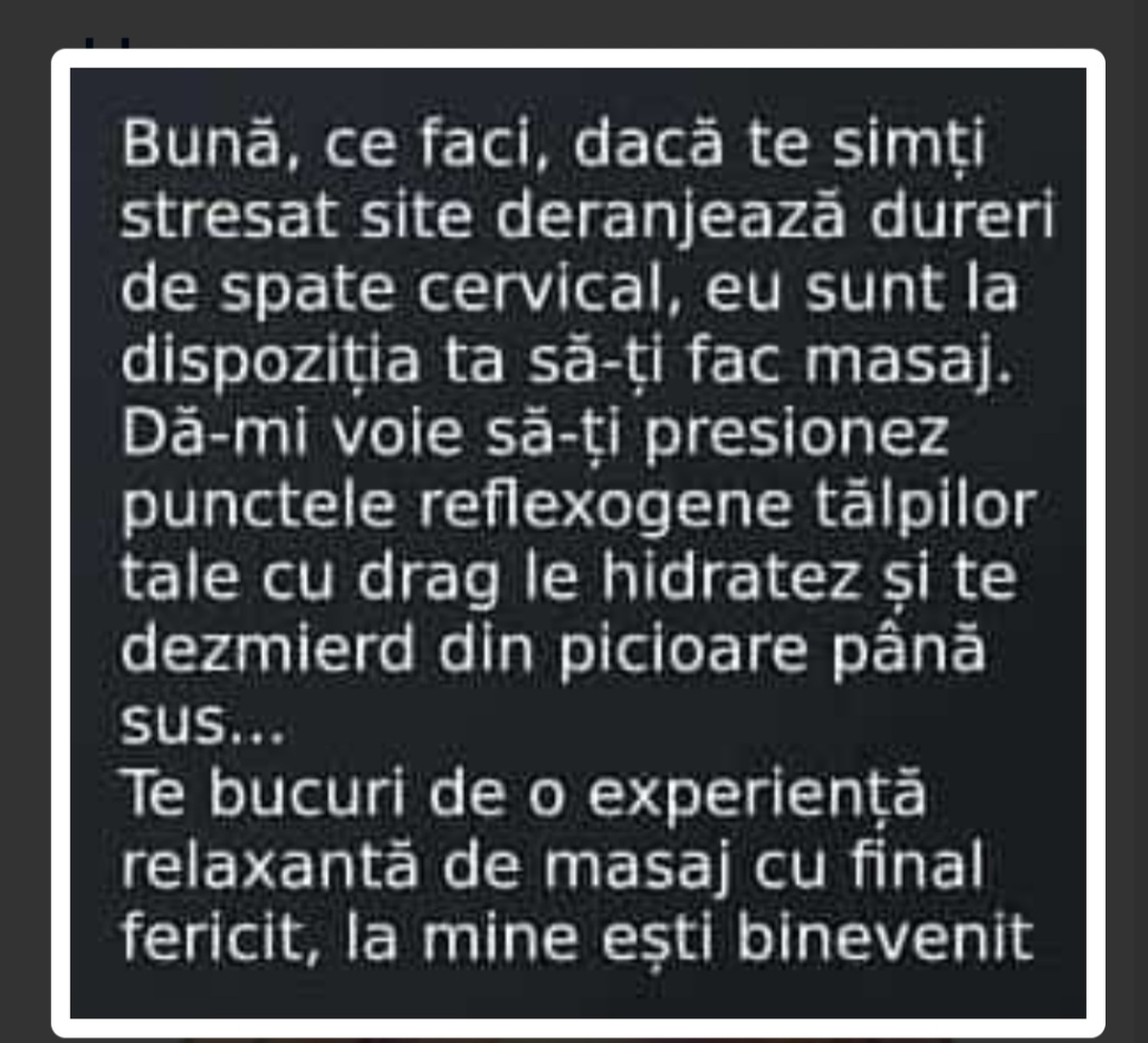 Buna. Pentru tine eu dispun de locatie primitoare si vreau sa-ti placa. Hai sa-ti ofer servicii de masaj nuru, total. Putem sa vorbim la telefon si video, apel pe WhatsApp chat Instagram Telegram. Daca nu raspund imediat, scuze si te rog frumos sa-mi trimiti mesaj, iti multumesc. Pupici.