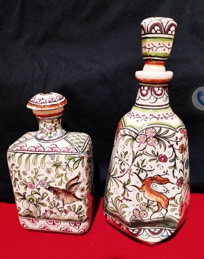 Doua vechi sticle cu dop din portelan Coimbra Portugalia, pictate manual.