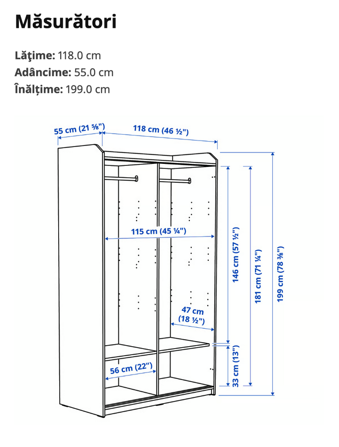 Dulap IKEA de haine cu usi glisante, alb –118x55x199 cm