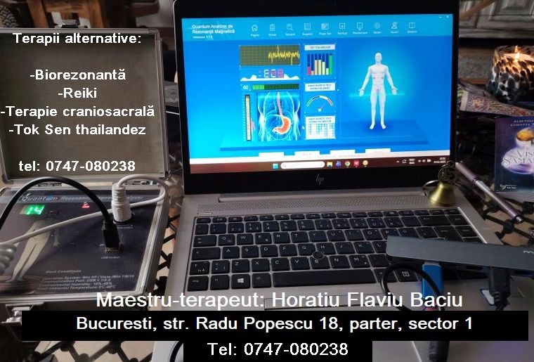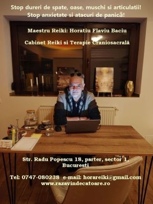 Maestrul-terapeut Horatiu Flaviu Baciu este specializat in tehnici de vindecare holistica Reiki si bioenergetica sacro-craniana, avand o experienta terapeutica de peste 15 ani. A lucrat multa vreme in Transilvania, dar acum se afla la Bucuresti, asa ca poti sa te vindeci mult mai simplu, daca esti din capitala sau din imprejurimi!