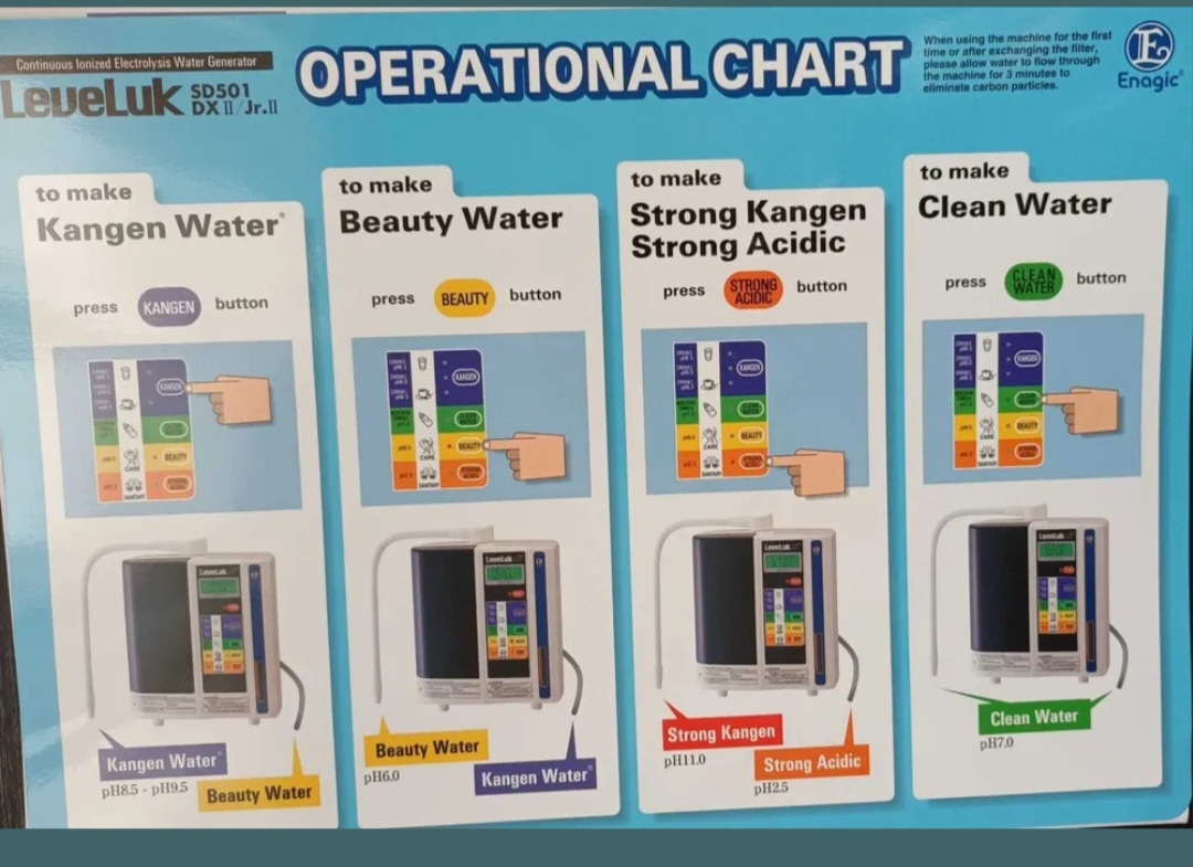 Caracteristicile produsului Placi cu electrozi: 4 Dimensiuni placi: (mm) 135 x 75 ORP negativ: (mV) -450 Interval pH: 2,5 - 11,5 Genera: 5 tipuri de apa Putere in wati (W) 120 Greutate totala: (kg) 5,3 Dimensiuni LHP: (mm) 264 x 338 x 171 Debit: (l / min) Apa Kangen®: 3,0 - 4,9 Apa acida: 0,2 - 1,9 Apa puternic acida: 0,3 = 0,7