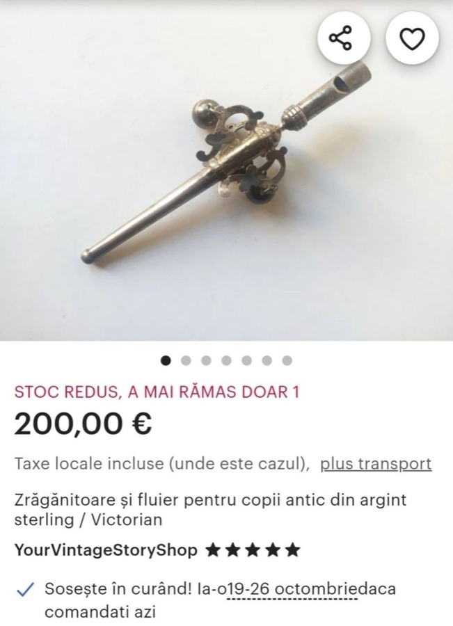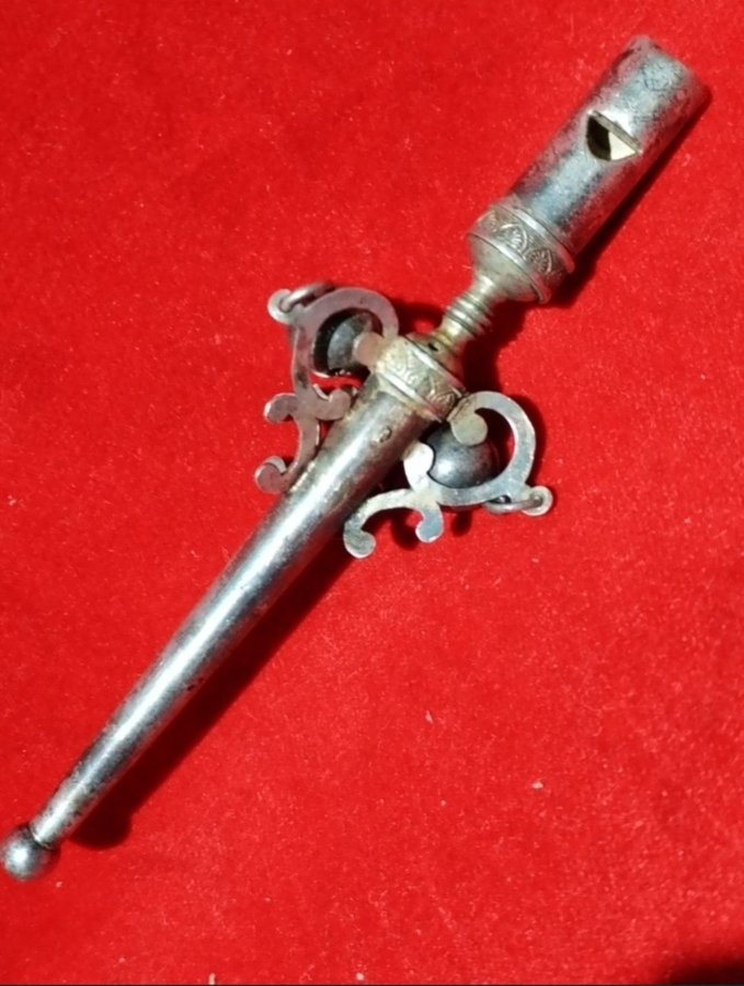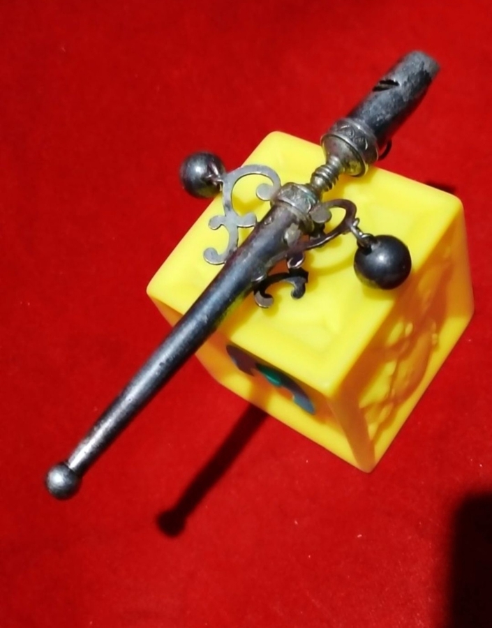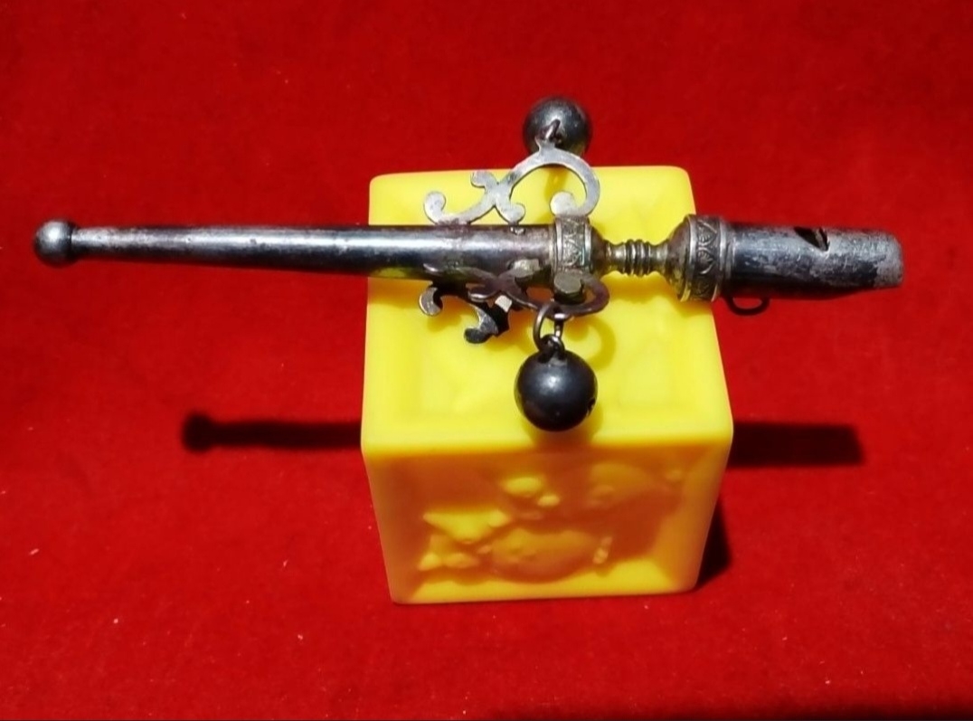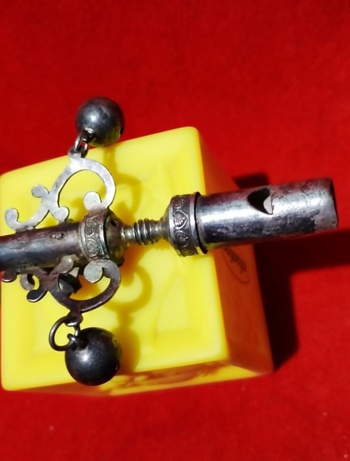 Fluier din argint pentru copii, cu bilute zanganitoare, epoca victoriana .