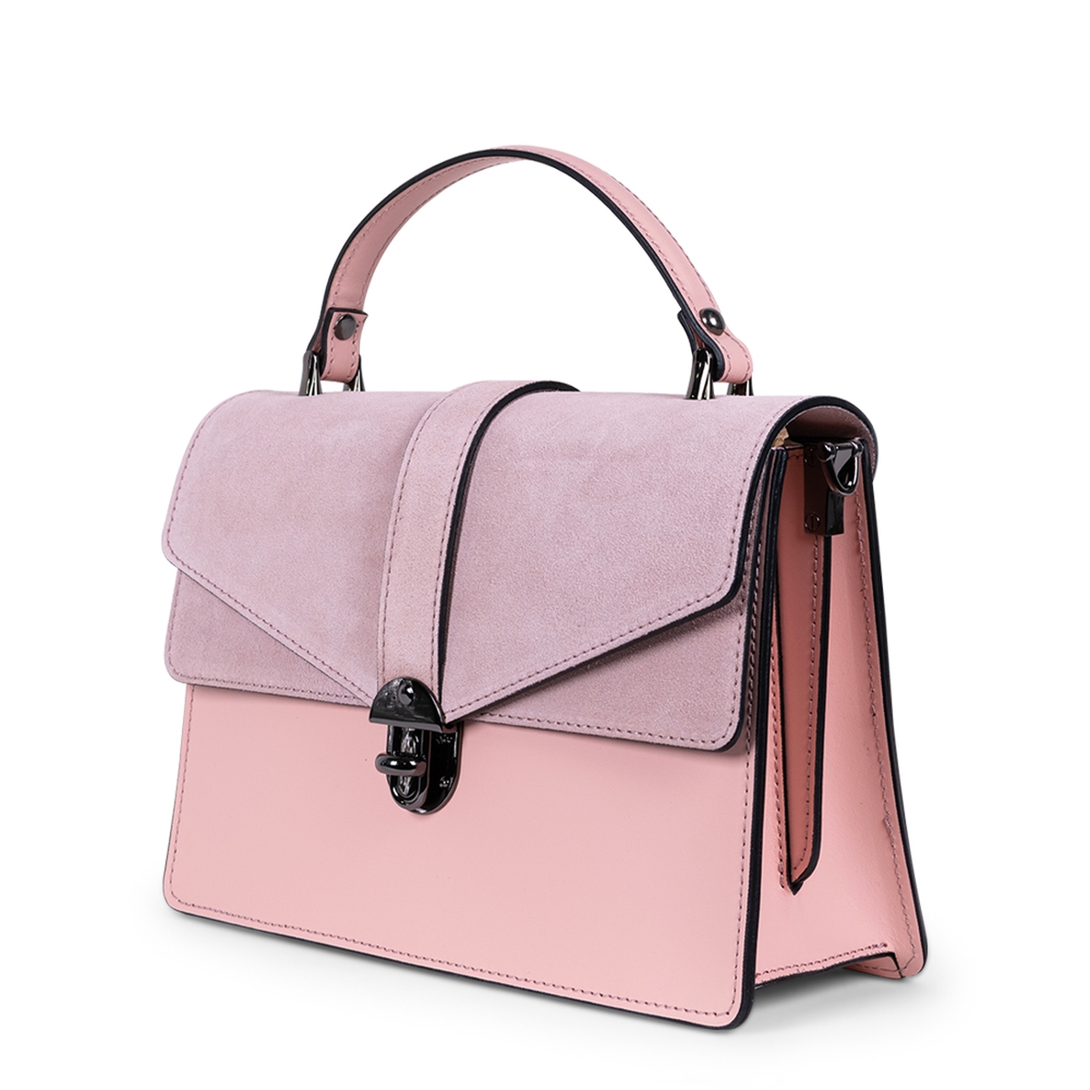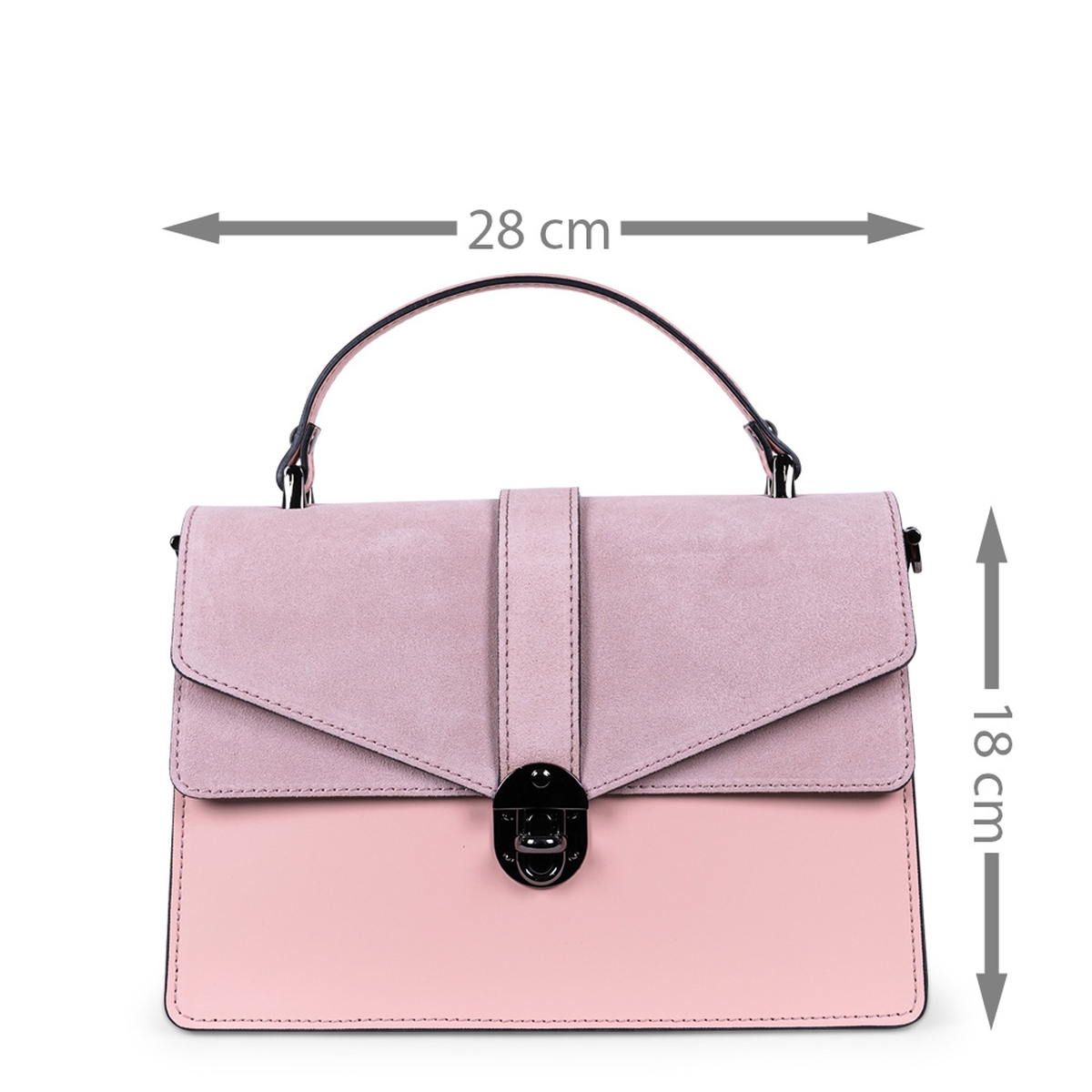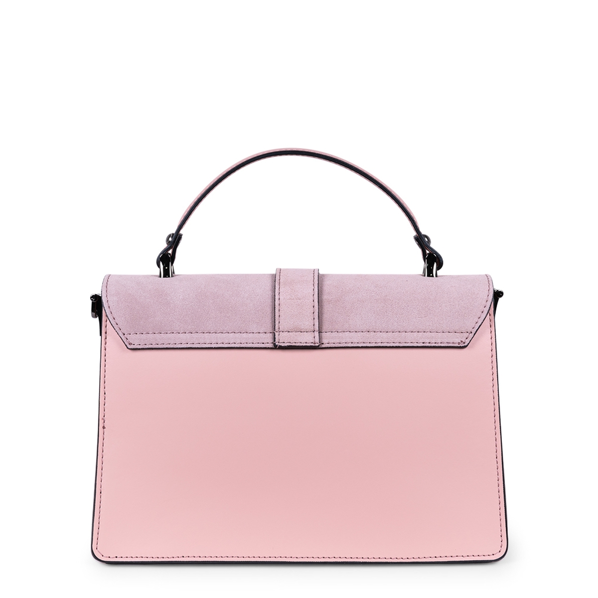 Geanta din piele naturala, de culoare roz prafuit are un design aparte, fiind creata atat din piele naturala mata, cat si piele naturala intoarsa. Are o structura usor rigida, pentru a-si mentine forma si poate fi asortata atat la tinutele business cat si casual- elegante.