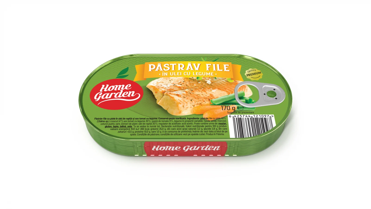 Pastrav file in ulei de rapita si sos tomat cu legume, conserva de peste sterilizata.