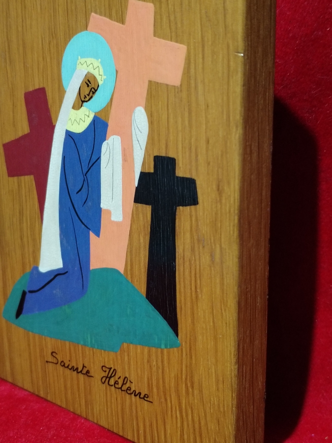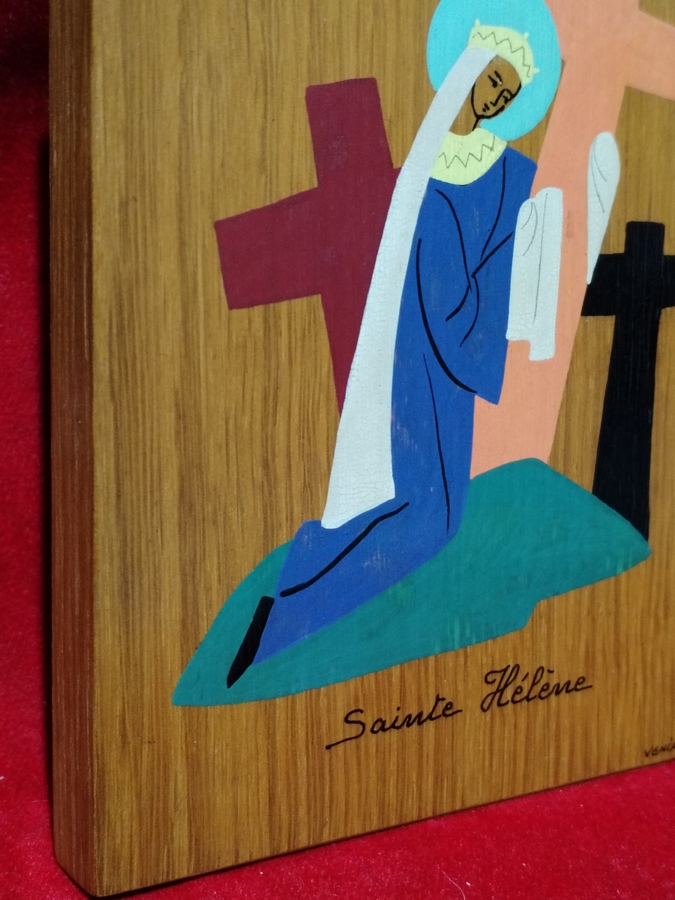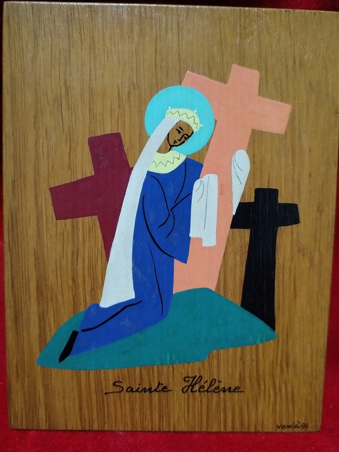 Icoana religioasa vintage Sfanta Elena, pictata manual pe lemn si semnata Veniere, atelierul monastic Abbate Notre Dame de Veniere.