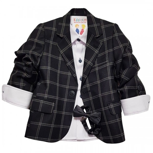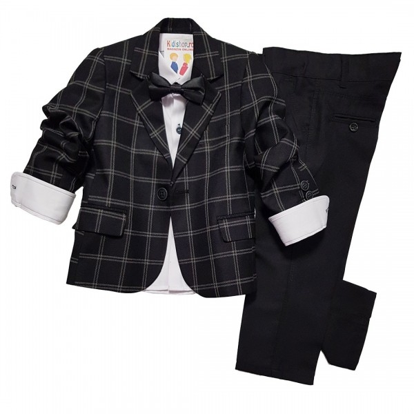 Set compus din: Sacou, camasa, pantaloni si papion. Sacou cu un rand de nasturi in fata, cu revere crestate. Buzunar la piept, buzunare cu clapa in fata ti un buzunar interior. Nasturi decorativi la mansete si slit la spate. Captusit. Camasa alba cu maneci lungi, cu guler si cu nasturi pe toata lungimea in fata. Pantaloni negri, din tercot subtire, cu slit si nasture, cu buzunare la spate. Papion detasabil. Compozitie bumbac. Fabricat in Turcia.