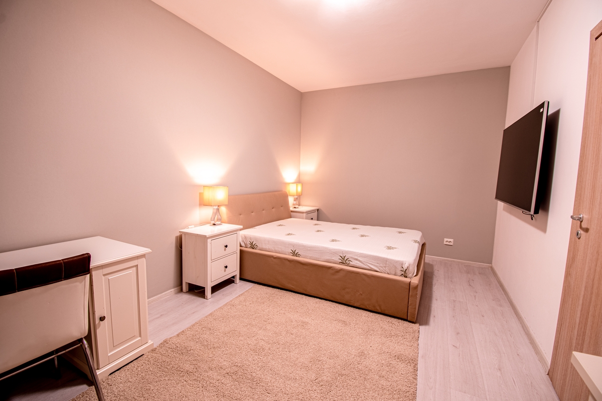 Locuinta se afla intr-un bloc nou, are o suprafata utila de 49 mp si este complet mobilata si utilata. Printre dotarile incluse se numara: masina de spalat, aragaz, cuptor, cuptor cu microunde, precum si doua televizoare cu diagonale de 163 cm si 155 cm.