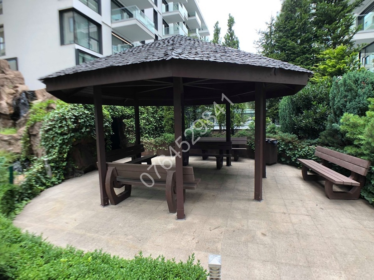 Gradina impersionata 3000mp, care te duce cu gandul la o pensiune de munte, cu 200 de specii de conifere si plante japoneze, fantani arteziene, loc de joaca pt copii, foisor, dar si un helesteu natural in aer liber cu pesti exotici viu colorati.
