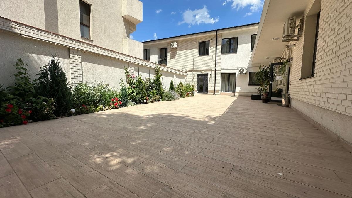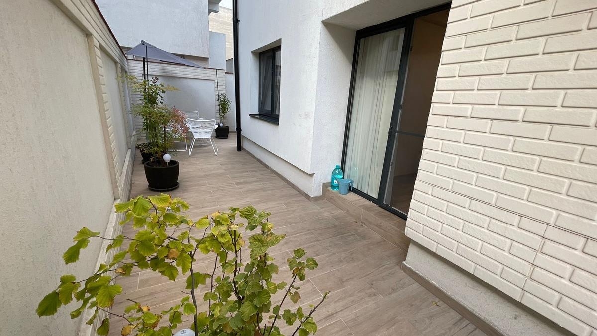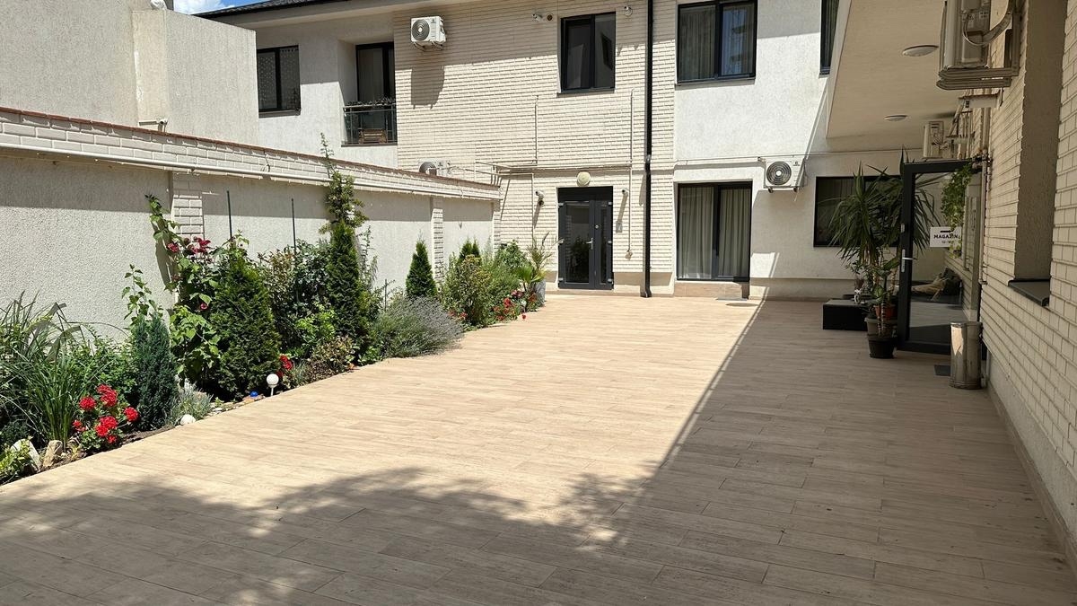 Acces direct la o curte comuna amenajata, cu pomi, flori si o atmosfera de comunitate placuta