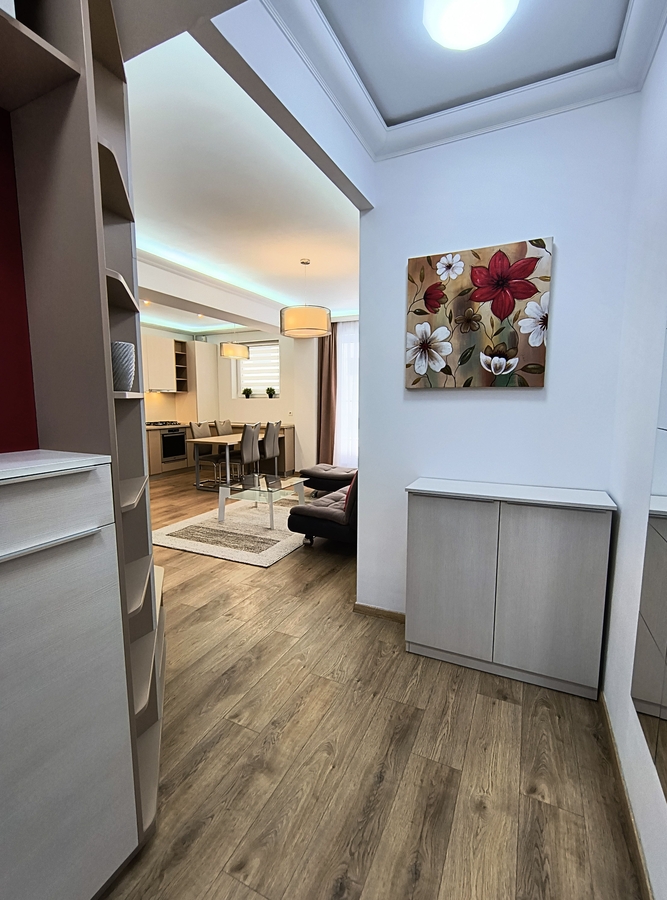 Apartamentul dispune de finisaje deosebite, de lux, climatizare, centrala termica, tamplarie PVC Salamander cu geamuri tripan , baie complet mobilata, bucatarie mare dotata cu electrocasnice noi si moderne (masina spalat vase, masina spalat rufe, frigider incorporat, cuptor electric, plita gaz, hota).