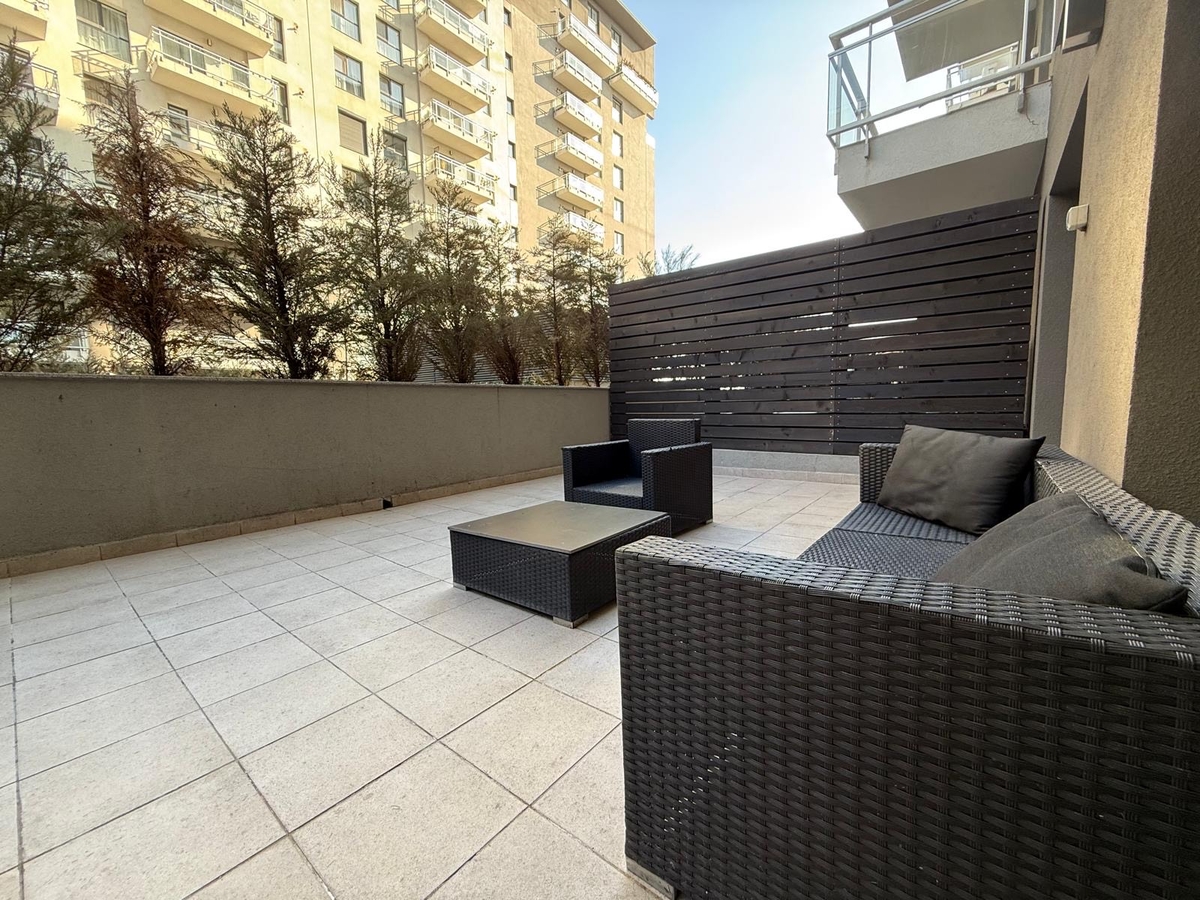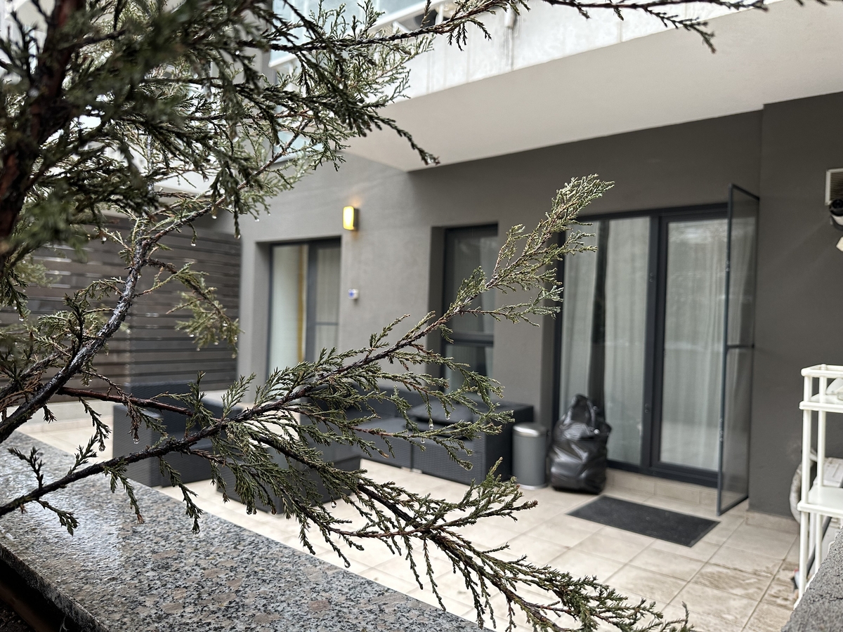 Apartamentul este situat la parter si dispune de o terasa de 20 de metri patrati, foarte frumoasa, inconjurata de braduti ornamentali. Terasa da intr-o zona de curte interioara, cu o peluza verde si linistita, ferita de trafic si de zgomotul masinilor.