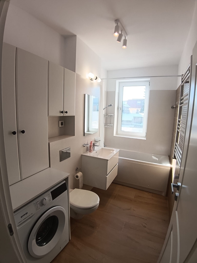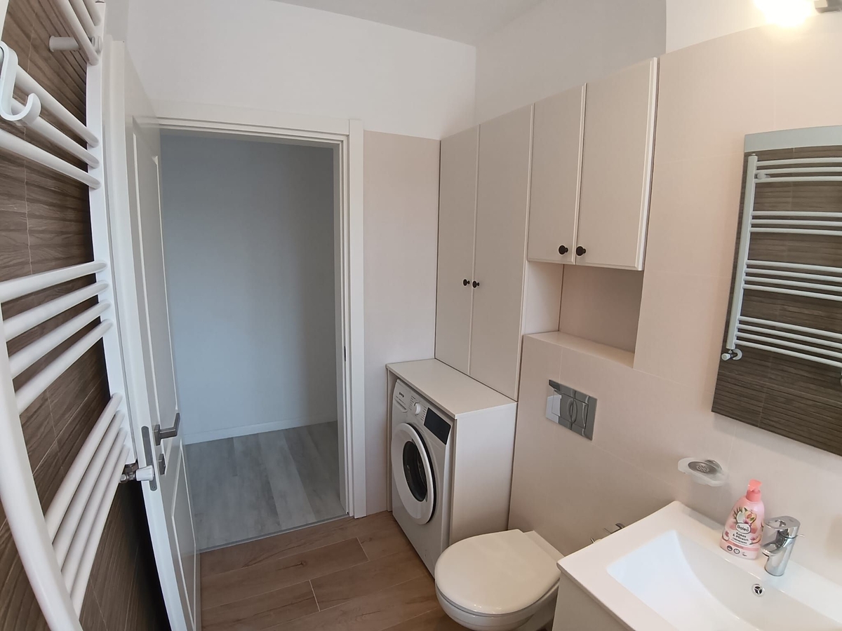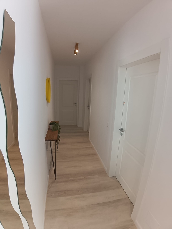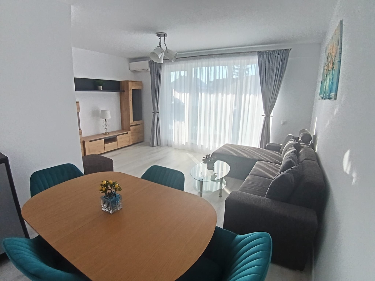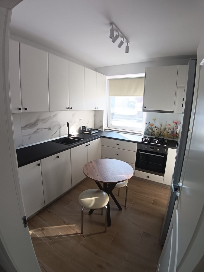 etaj 1, apartament nou finisat, mobilat si echipat. Centrala proprie, contoare utilitati. Loc parcare in garaj, 125 euro/ luna.