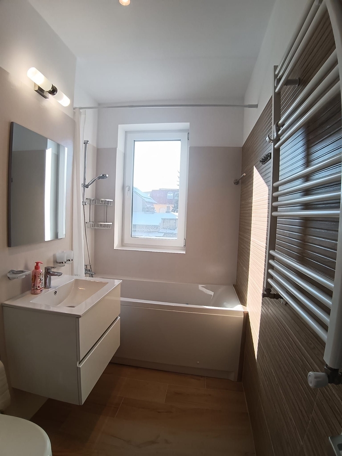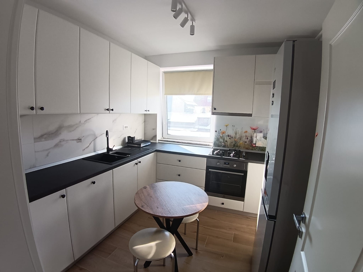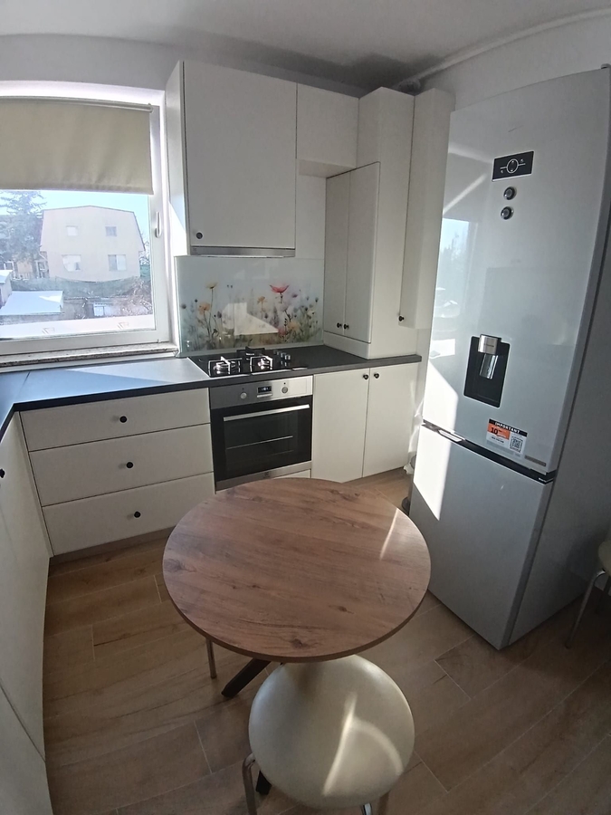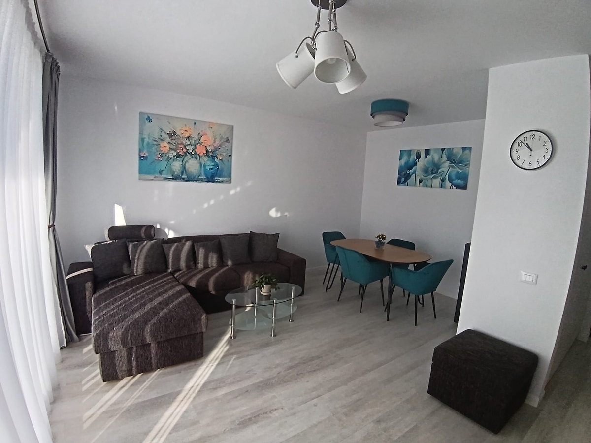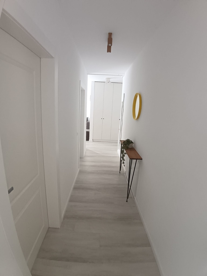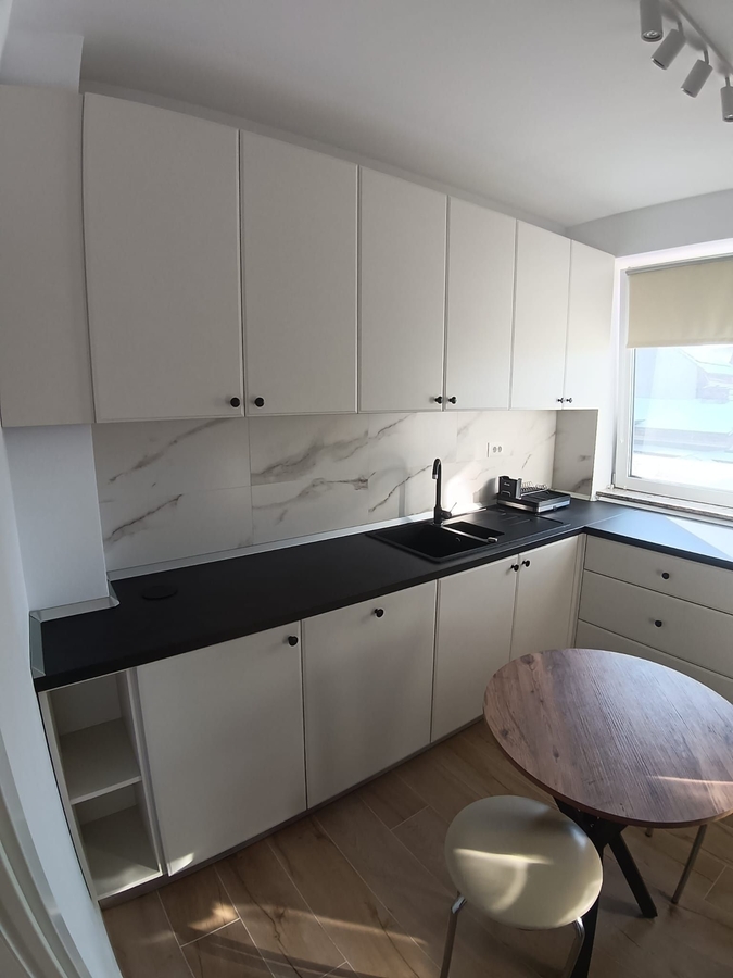 etaj 1, apartament nou finisat, mobilat si echipat. Centrala proprie, contoare utilitati. Loc parcare in garaj, 125 euro/ luna.