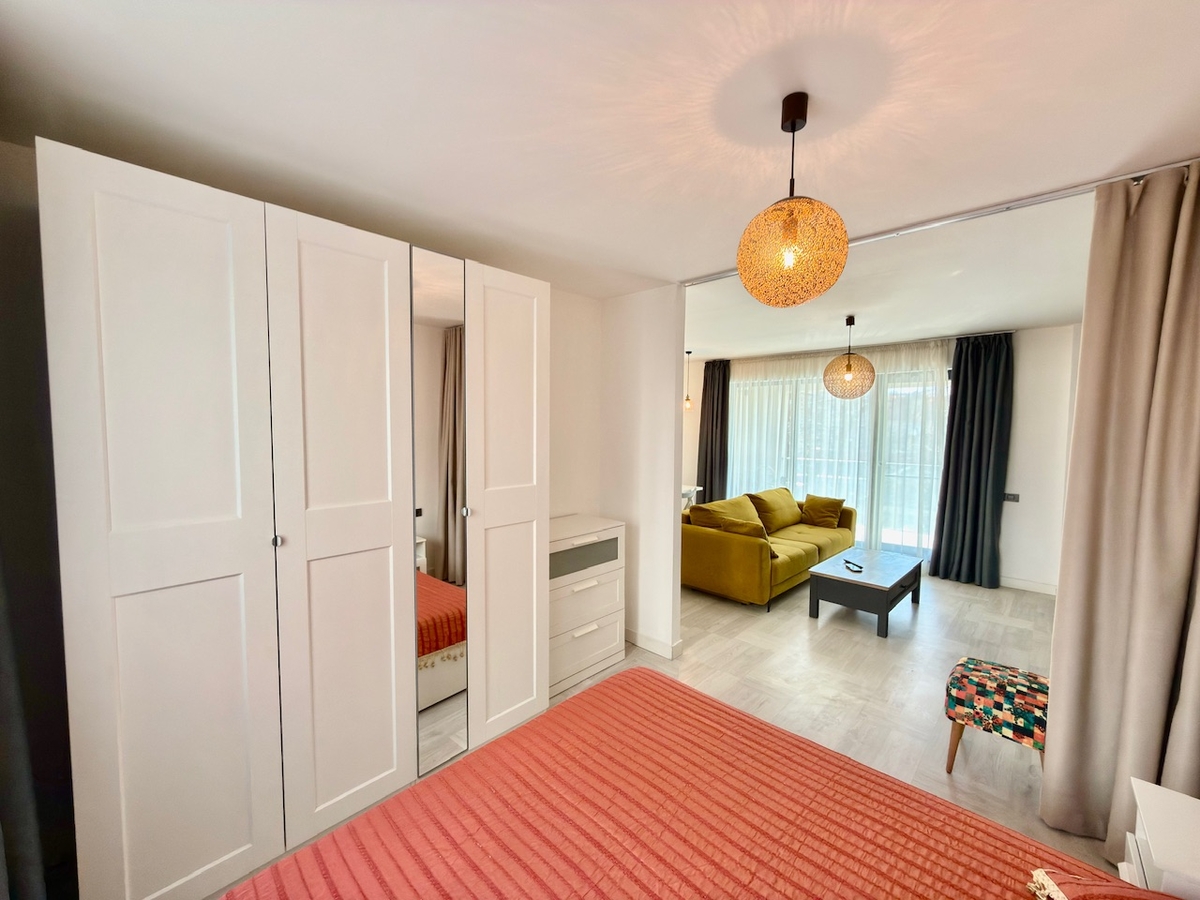 Ferestrele mari pana in pardoseala ofera lumina naturala si creeaza o atmosfera eleganta si aerisita.
