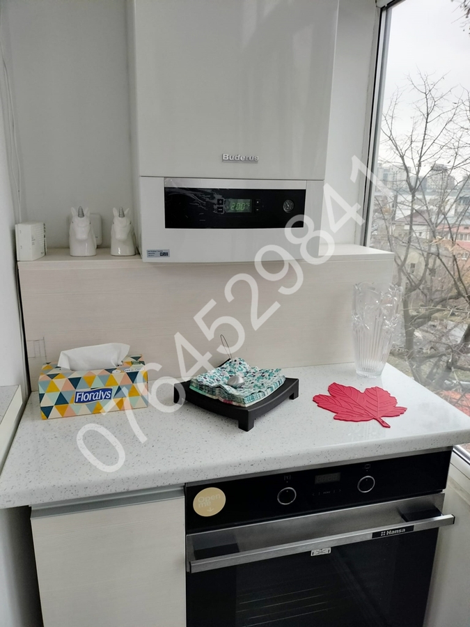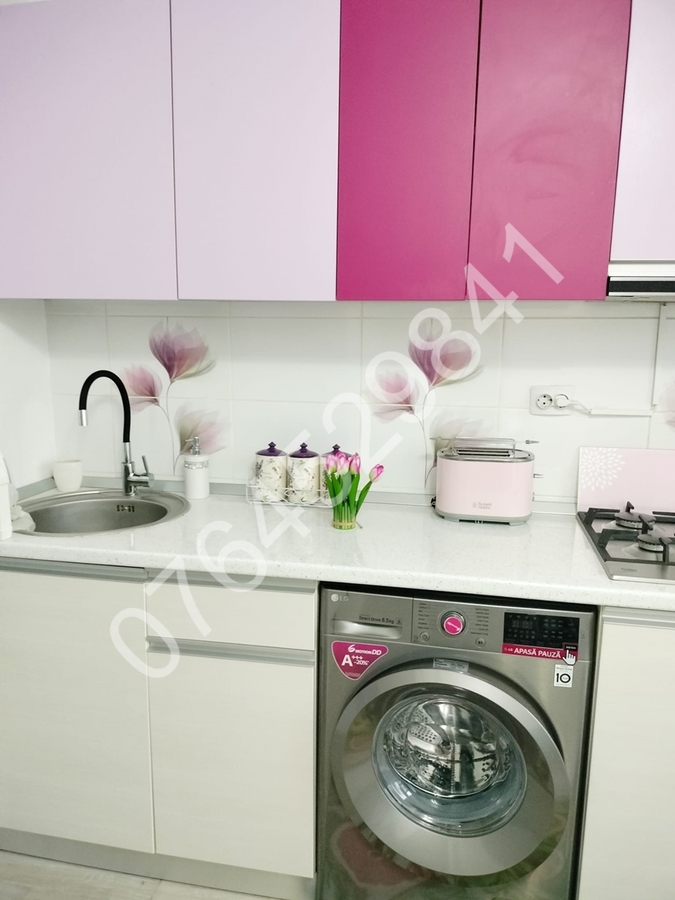 Balcon inchis in termopan, centrala termica (pe gaz) de apartament, aer conditionat, televizor led, canapea extensibila+fotoliu in living, pat matrimonial in dormitor, dressing, spatii depozitare, plita pe gaz+ cuptor electric+hota incorporate, aspirator, masina de spalat rufe, combina frigorifica, suport rufe.