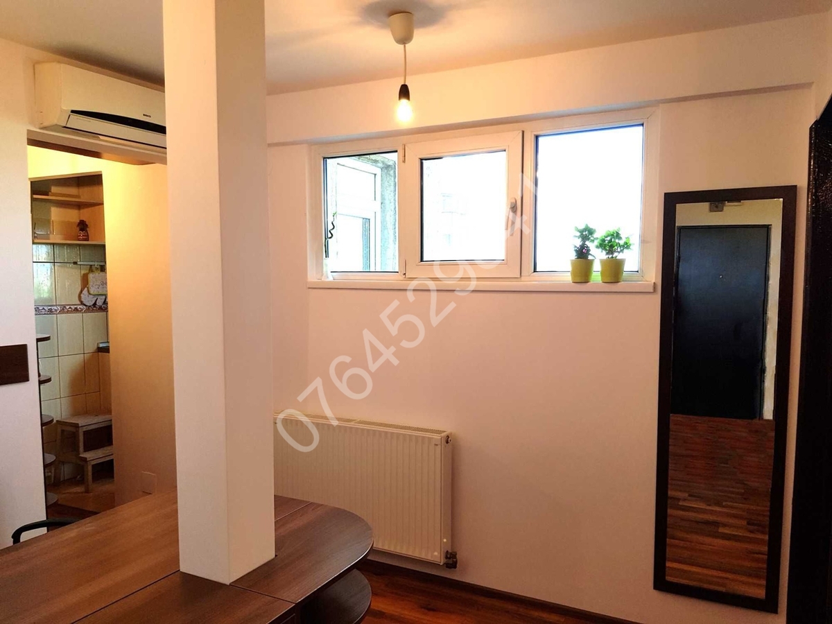 Balcon inchis in termopan, aer conditionat, televizor smart, canapea extensibila+zona dining in living, pat SINGLE+dressing generos in dormitor, zona birou work from home pe hol, spatii depozitare, aragaz, cuptor, combina frigorifica, masina de spalat rufe.