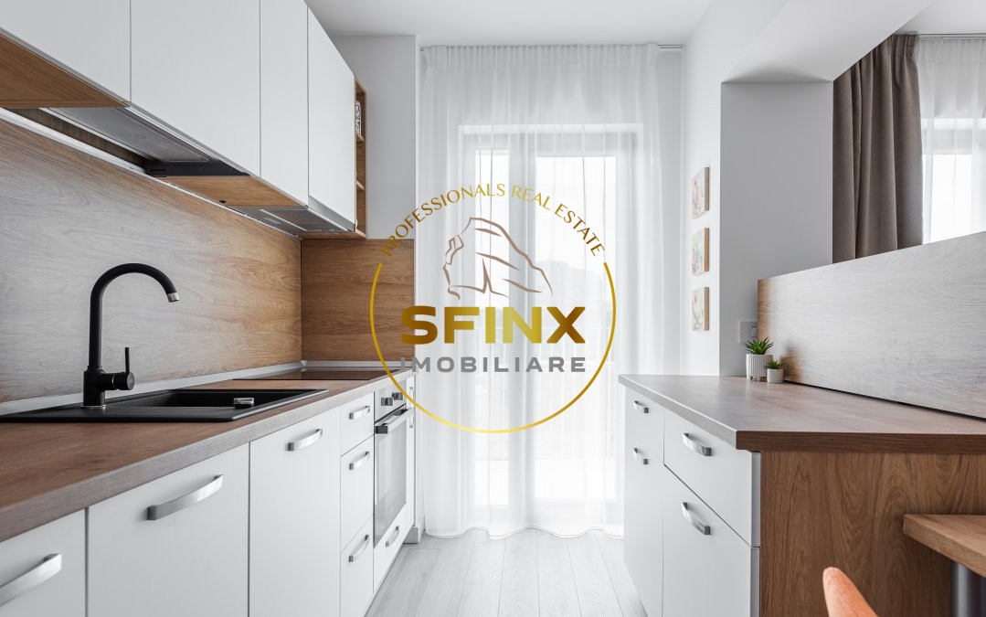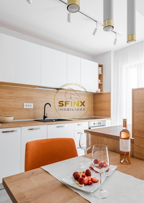 Mobilat si utilat complet cu electrocasnice premium: plita electrica, cuptor cu autocuratire, masina de spalat vase, masina de spalat rufe, combina frigorifica full no frost;