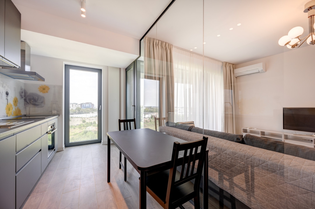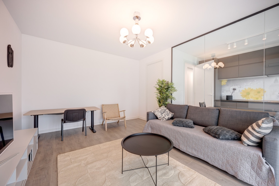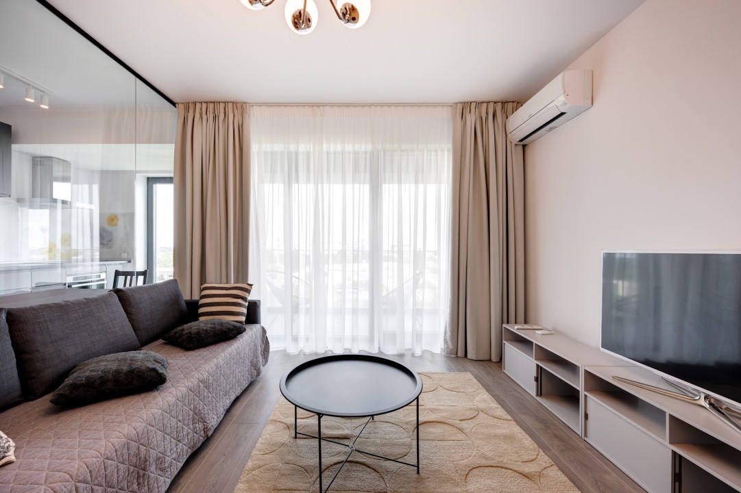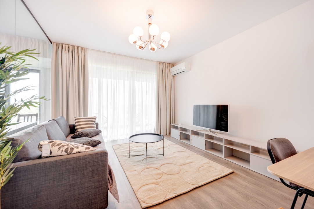 va prezint spre inchiriere un apartament cu 2 camere, in suprafata total utila de 57.5 mp situat la etajul 5, in ansamblul Cloud9 Pipera. Apartamentul se preda complet mobilat si utilat. Acesta a fost amenajat dupa un proiect al unui designer de interior, fiind valorificat tot spatiul. Dispune de un loc de parcare in subteranul imobilului. Imobilul are receptie si 2 lifturi, ambele acces catre garaj.